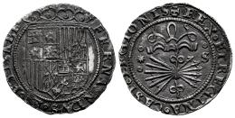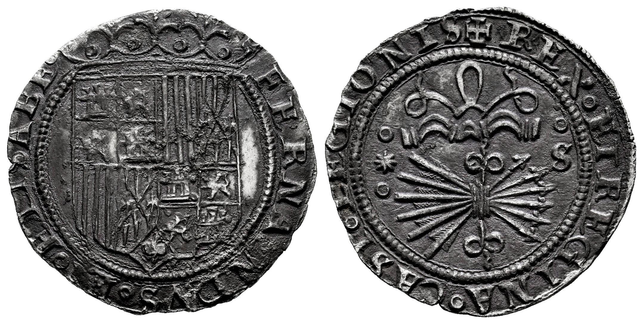 Fernando e Isabel (1474-1504). 1 real. Sevilla. (Cal-415). Ag. 3,24 g. S y estrella de 8 puntas en el reverso y tres roeles decorando el campo. Leyendas completas. Pátina ligeramente rugosa. MBC+. Est...150,00.