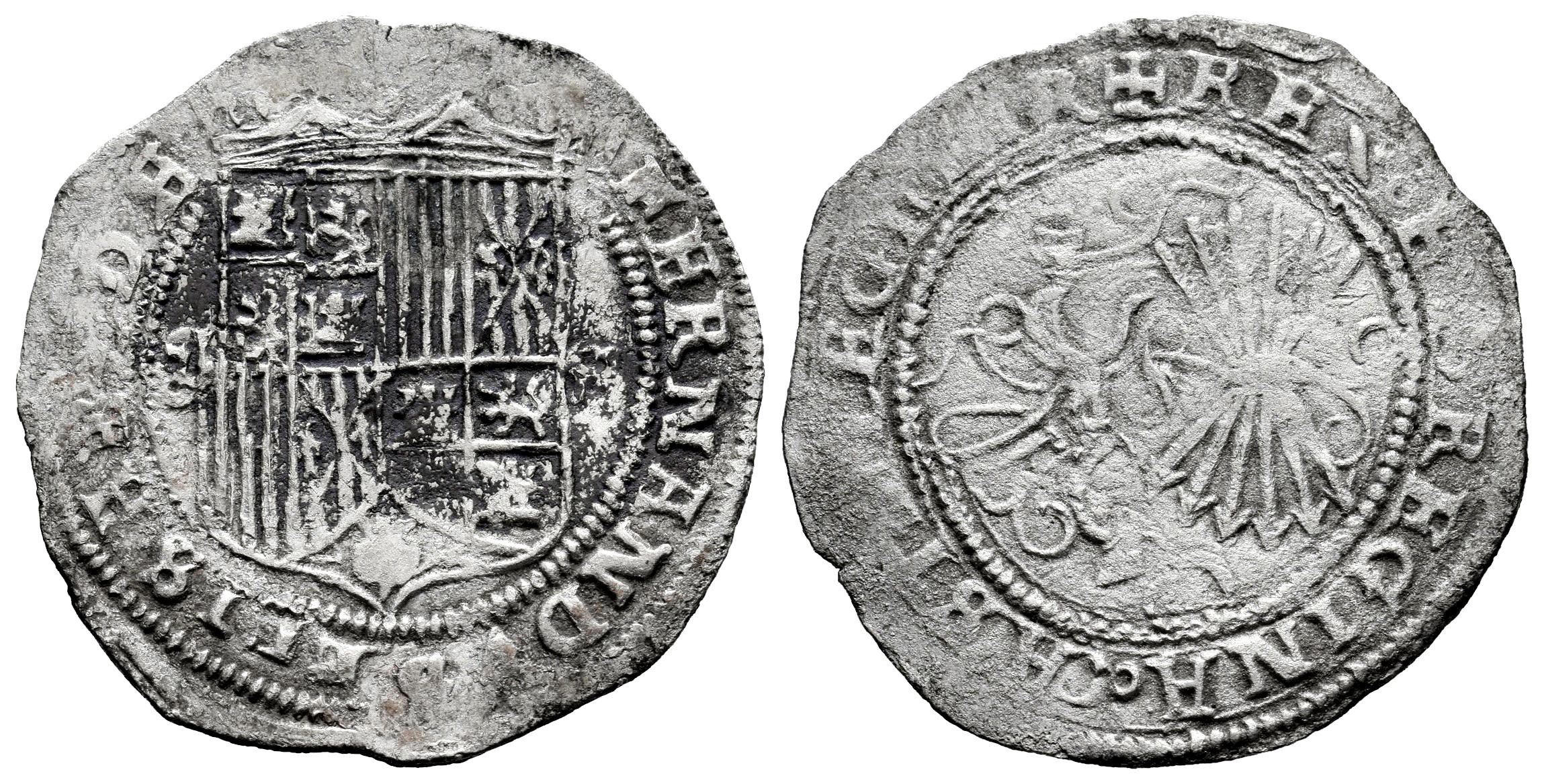 Fernando e Isabel (1474-1504). 1 real. Sevilla. (Cal-714 var). Ag. 3,19 g. S-S a los lados del escudo y sin marcas en el reverso. Acuñación muy redonda con las leyendas casi completas. Oxidaciones superficiales. MBC-. Est...100,00.