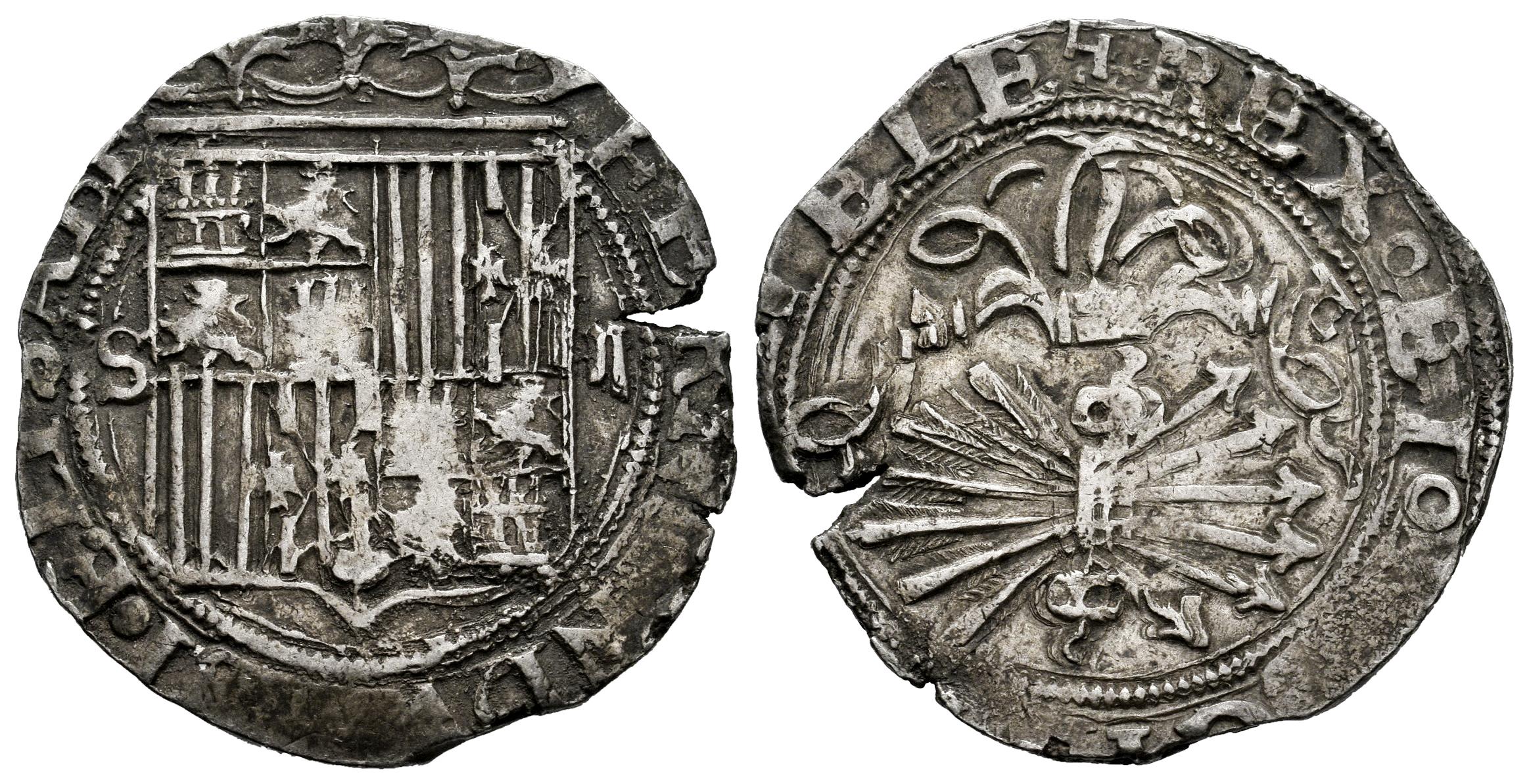 Fernando e Isabel (1474-1504). 2 reales. Sevilla. (Cal-514). (Bautista-2114). Ag. 6,80 g. Escudo entre S - II. Pátina. MBC/MBC-. Est...150,00.