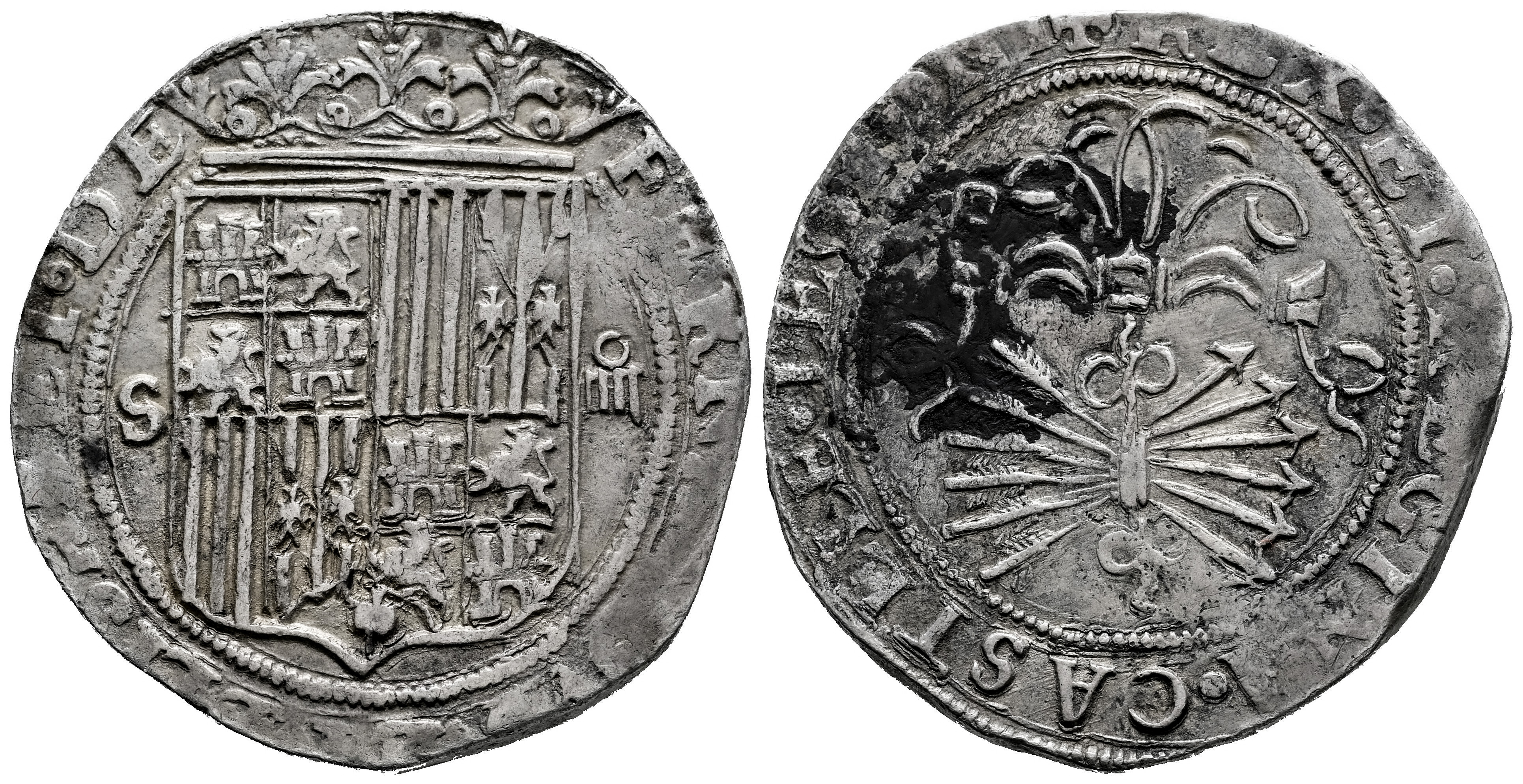 Fernando e Isabel (1474-1504). 4 reales. Sevilla. (Cal-564). (Bautista-2139.1). Anv.: FERNANDVS ◦ ET ◦ ELISABET ◦ DE. Escudo entre S-IIII. Rev.: + REX · ET · REGINA · CASTELE · LEGIONI. Ensayador d cuadrada a la izquierda y sobre el yugo. Ag. 13,43 g. MBC. Est...220,00.