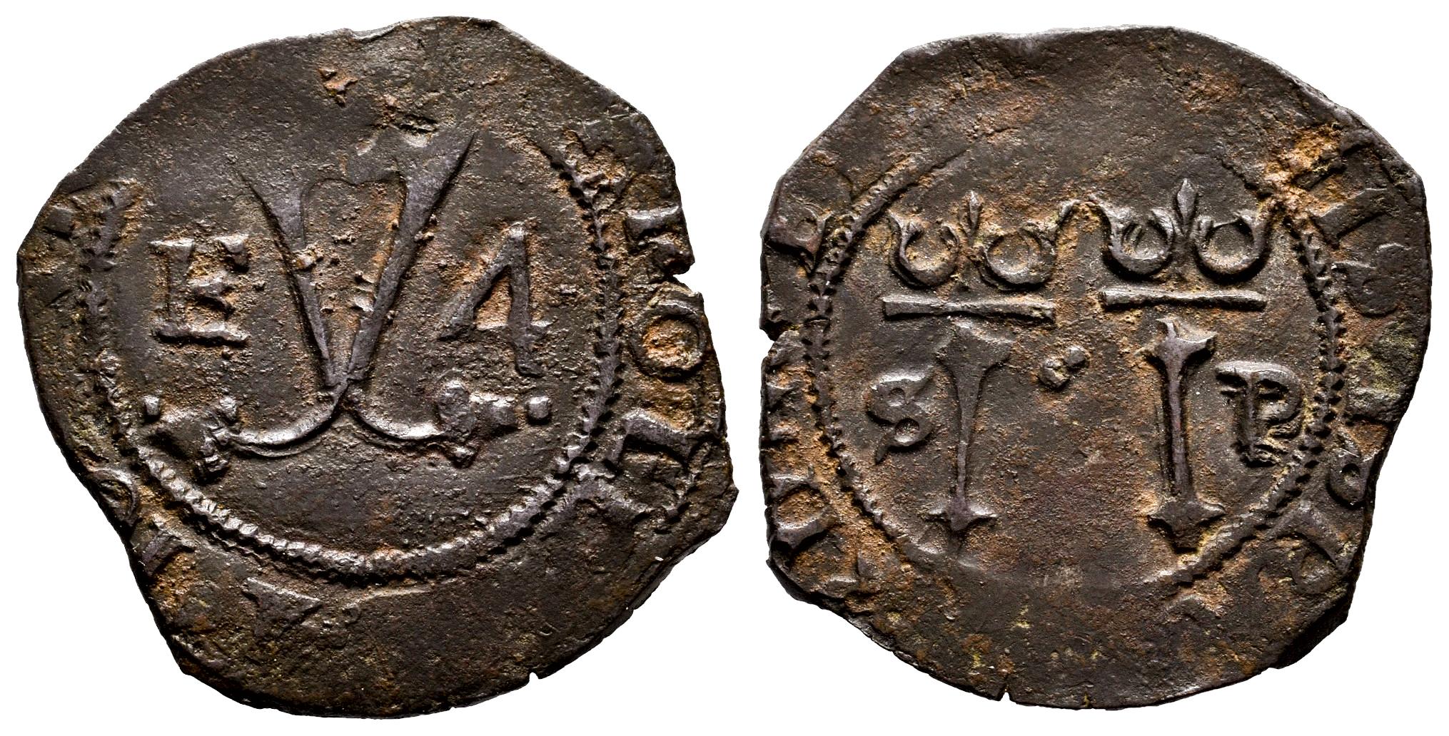 Juana y Carlos (1504-1555). 4 maravedís. ND (ca. 1542). Santo Domingo. F / S-P. (Cal-33). Ae. 3,53 g. Valor 4. La F invertida, parece una E. Ligeras oxidaciones. MBC/MBC+. Est...75,00.
