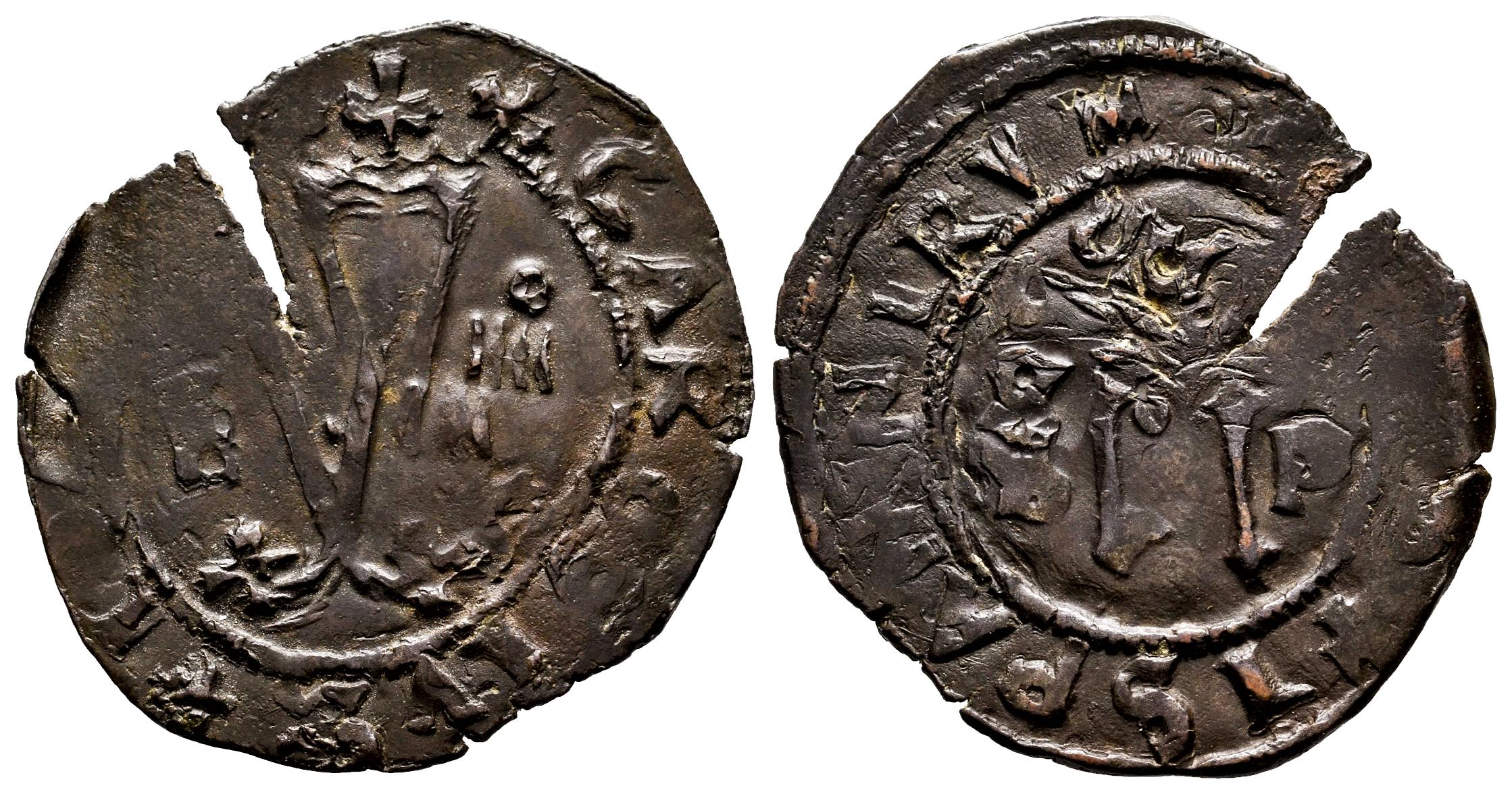 Juana y Carlos (1504-1555). 4 maravedís. ND (ca. 1542). Santo Domingo. F / S-P. (Cal-35). Ae. 2,93 g. Valor IIII. La F parece una E. Doble acuñación y grieta, aún así gran parte de las leyendas visibles y acuñación muy nítida. MBC+. Est...120,00.