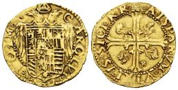 Carlos I (1516-1556). 1 escudo. ND. Nápoles. R. (Tauler-57 var.). (Vti-No cita). (Mir-132/2 var.). Anv.: CAROLVs ◦ - ◦ V ◦ RO ◦ IM ◦. Rev.: ◦ AISPARVM ◦ VTRIVS ◦ SICI ◦ R ◦ R ◦. Au. 3,38 g. R en el 4º cuadrante. MBC+. Est...750,00.