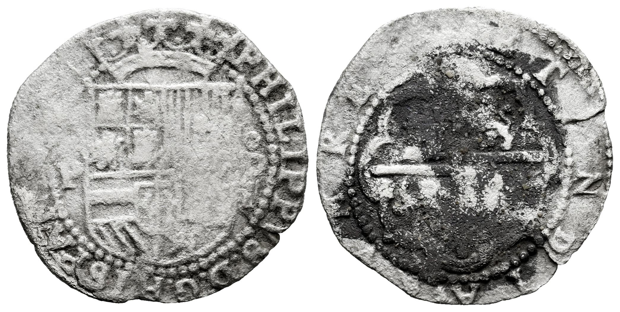 Felipe II (1556-1598). 1 real. ND (1577-1588). Lima. D (Diego de la Torre). (Cal-214). Ag. 3,15 g. ✶/P a la izquierda del escudo, oD/I a la derecha. Oxidaciones limpiadas. Pequeña grieta. Suave pátina. Rara. MBC+. Est...350,00.