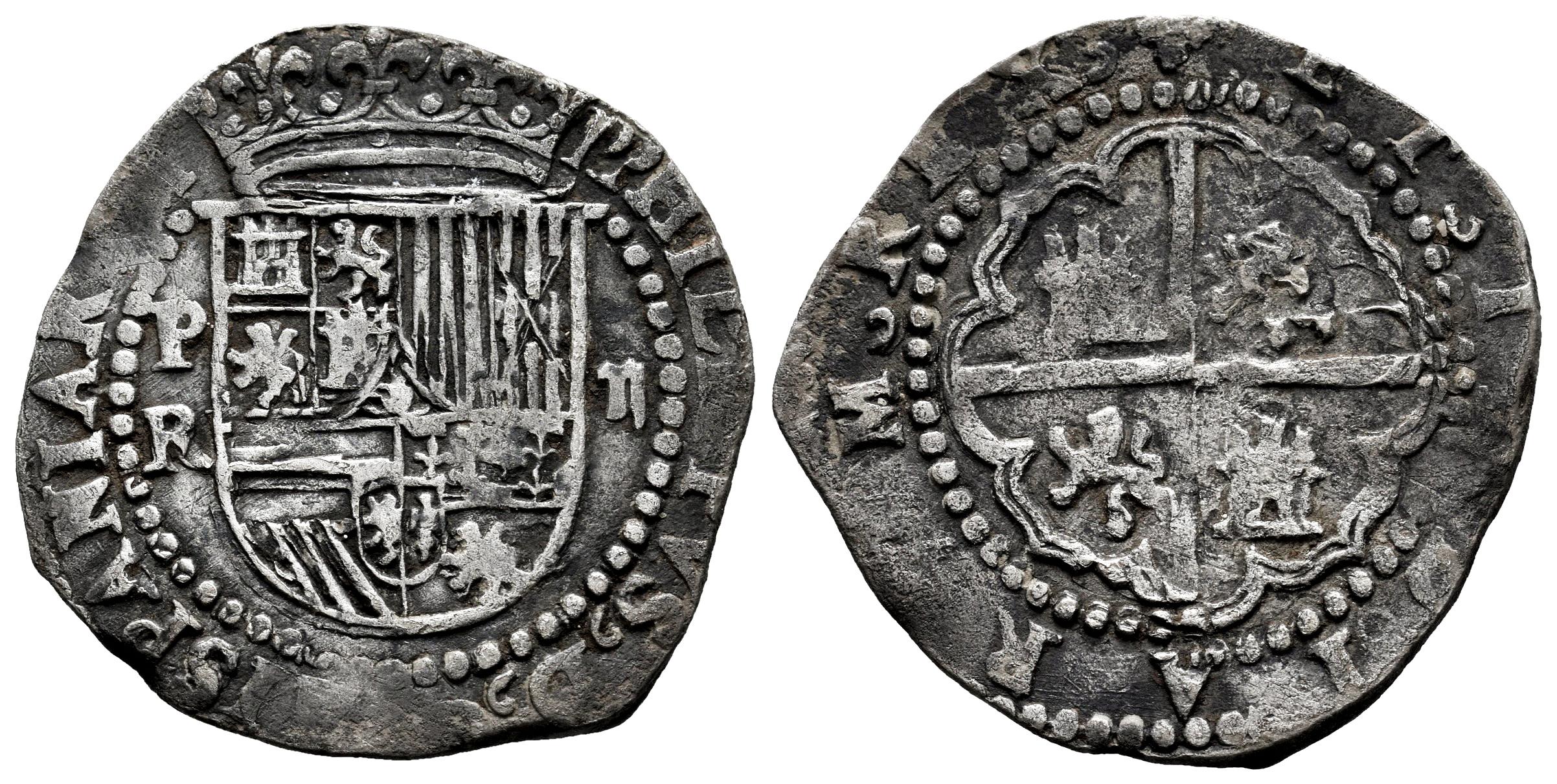 Felipe II (1556-1598). 2 reales. ND (1574-1576). Potosí. R (Alonso Rincón). (Cal-364). Ag. 6,42 g. Buena acuñación para este tipo. Flan grande y bastante redondo. Leyendas casi completas. Muy escasa en esta conservación. MBC+. Est...350,00.