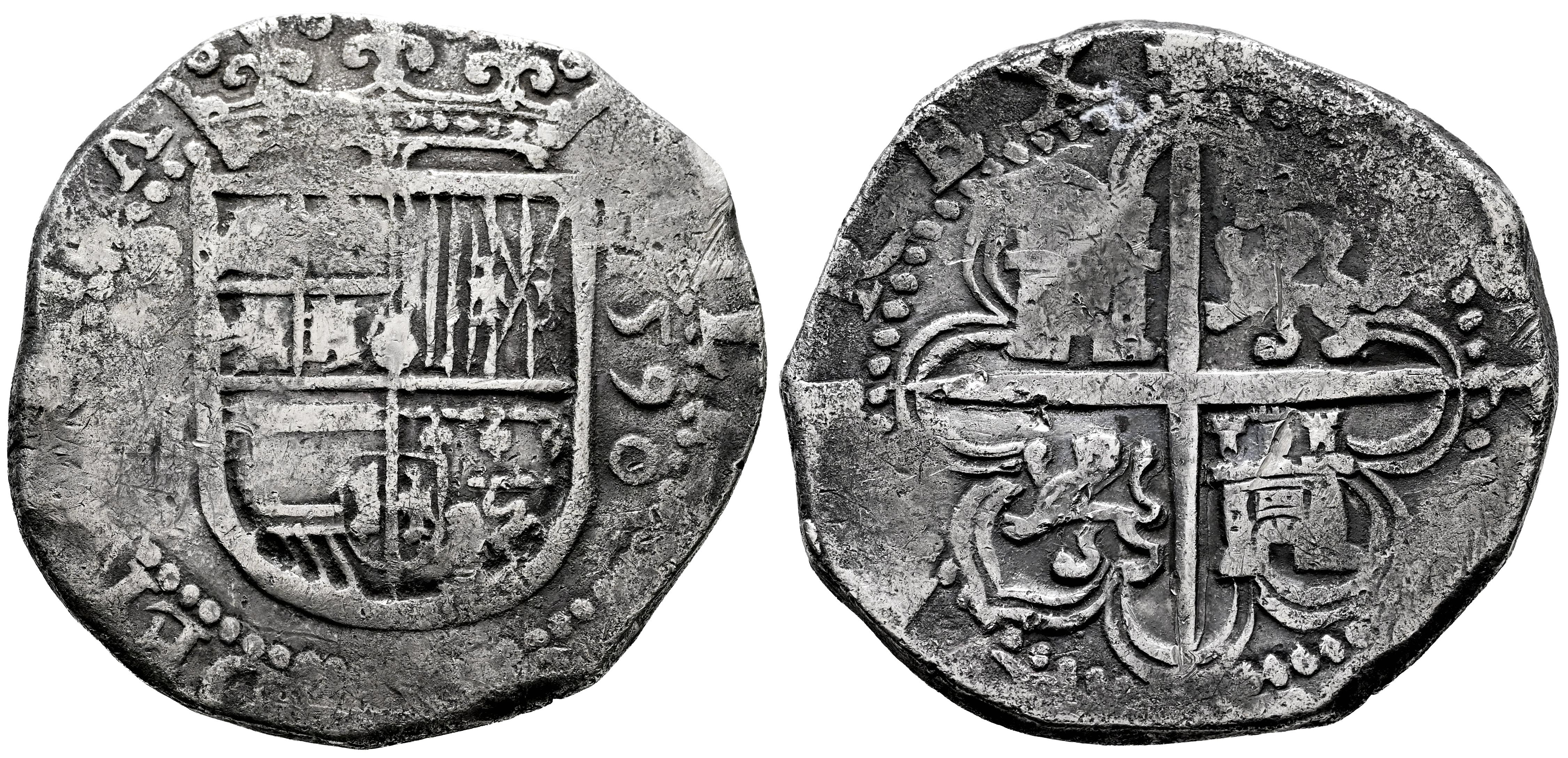 Felipe II (1556-1598). 8 reales. 1590. Sevilla. (Cal-728 similar). Ag. 26,91 g. Fecha completa de 4 dígitos a la derecha del escudo, en vertical. Ensayador no visible. Escasa. Compra privada a F. Segarra en Marzo de 2004. Ex Colección José Octavio Busto. Conserva etiqueta del coleccionista. MBC-. Est...300,00.