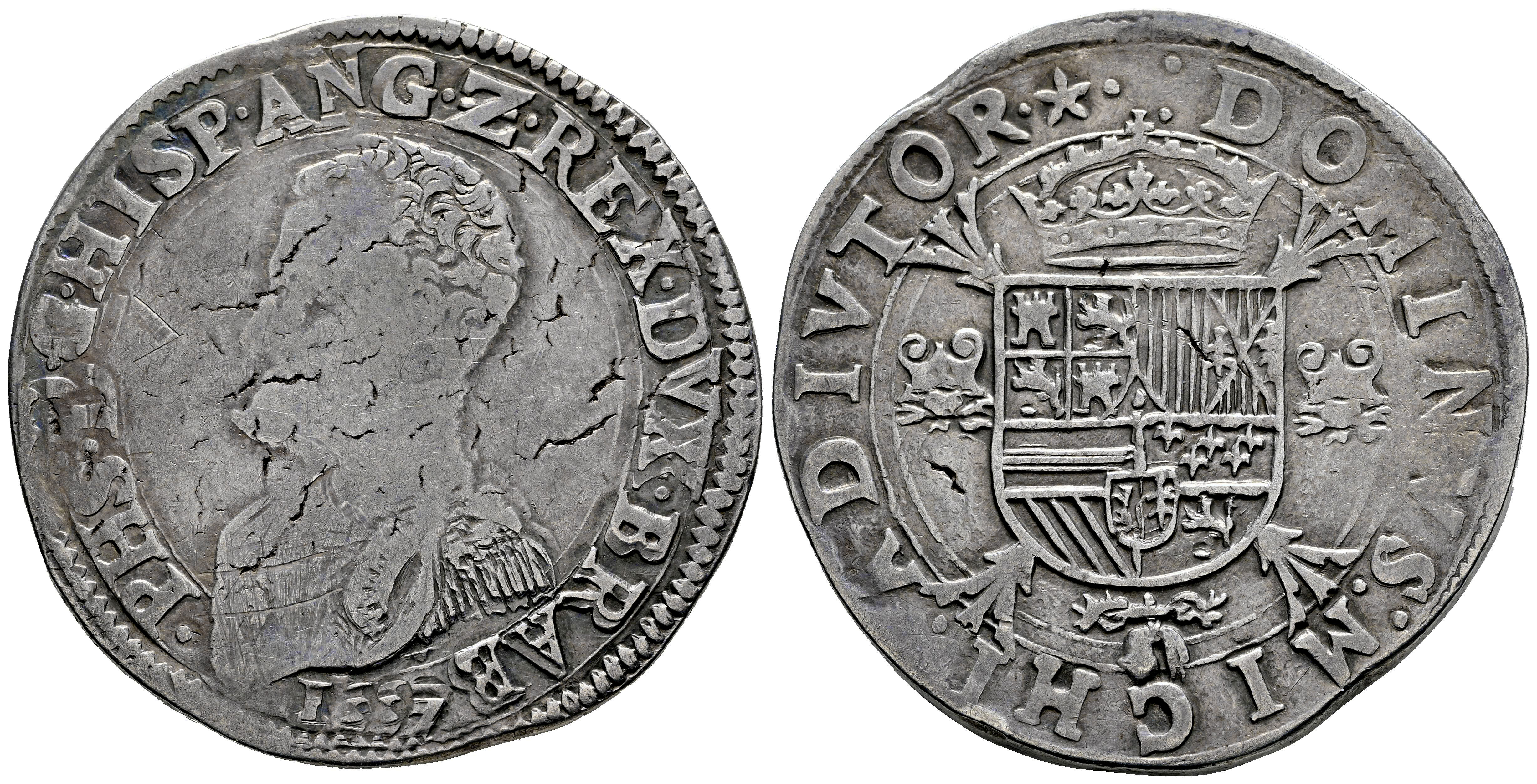 Felipe II (1556-1598). 1 escudo felipe. 1557. Maastricht. (Tauler-1153). (Vti-1171). (Vanhoudt-253.MA). Ag. 32,95 g. Leve plata agria y acuñación floja en anverso. Tono. Escasa. MBC-/MBC+. Est...400,00.