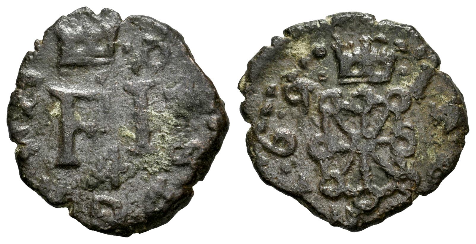 Felipe III (1598-1621). 4 cornados. 1609 (·I·6·9·). Pamplona. (Cal-64). (Ros-4.4.10). Anv.: · P H · S · D · G · R · N · A. Rev.: · I · N · S (· A ·) N · I · 6 · 9 · . Ae. 2,92 g. El dígito final de la fecha "9" parece haber sido corregido sobre otro número o podría tratarse de una rotura de cuño, una posibilidad que consideramos al observar que la gráfila de puntos en esa área está desplazada hacia abajo. MBC-. Est...50,00.