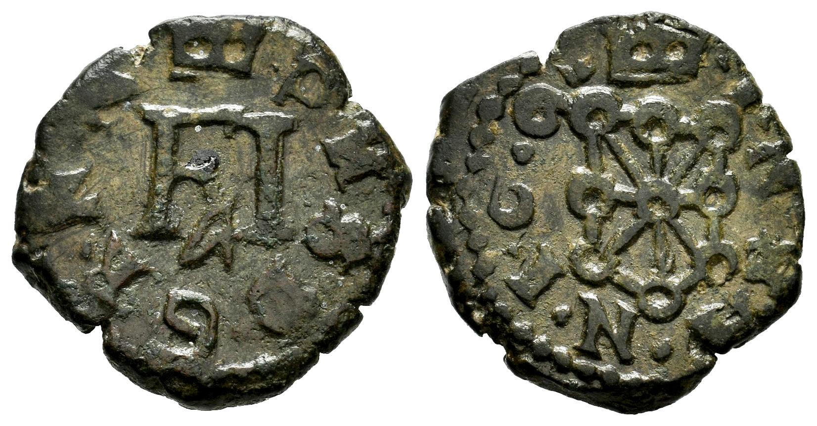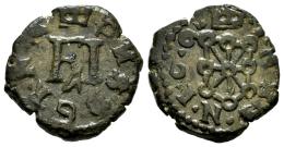 Felipe III (1598-1621). 4 cornados. 1609 (·I·6·9·). Pamplona. (Cal-64 var.). (Ros-No cita). Anv.: P H S · D · G · R · N · N. Rev.: · I · N · S · A · N · I · 6 · 9 · . Ae. 4,45 g. La leyenda del anverso termina en ·N·N. Rara. MBC/MBC+. Est...80,00.