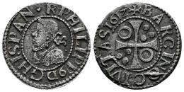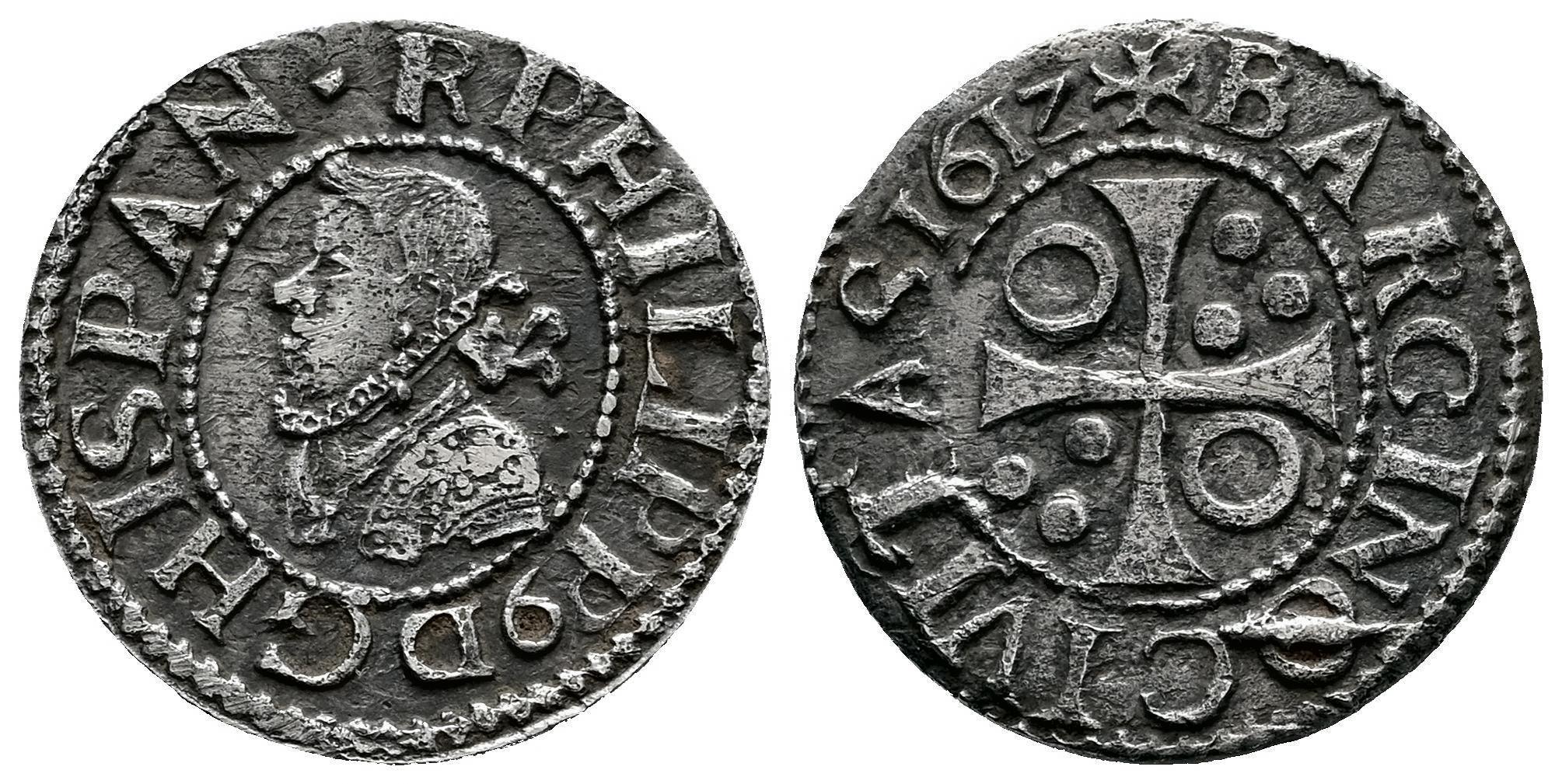 Felipe III (1598-1621). 1/2 croat. 1612. Barcelona. (Cal-375). (Cru C.G-4342b). Anv.: PHILIPP❜D G HISPAN · R. Rev.: + BARCINO CIVITAS 1612. Ag. 1,46 g. Sin puntos divisores en la leyenda del anverso, solamente entre HISPAN y R. Metal algo poroso. MBC. Est...60,00.