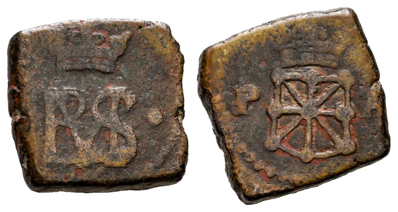 Felipe IV (1621-1665). Cornado. ND. Pamplona. (Cal-58). (Ros-4.5.47). Anv.: Monograma coronado acotado por puntos a ambos lados. Rev.: Escudo de Navarra coronado entre P - A. Ae. 3,03 g. Escasa. BC/BC+. Est...50,00.