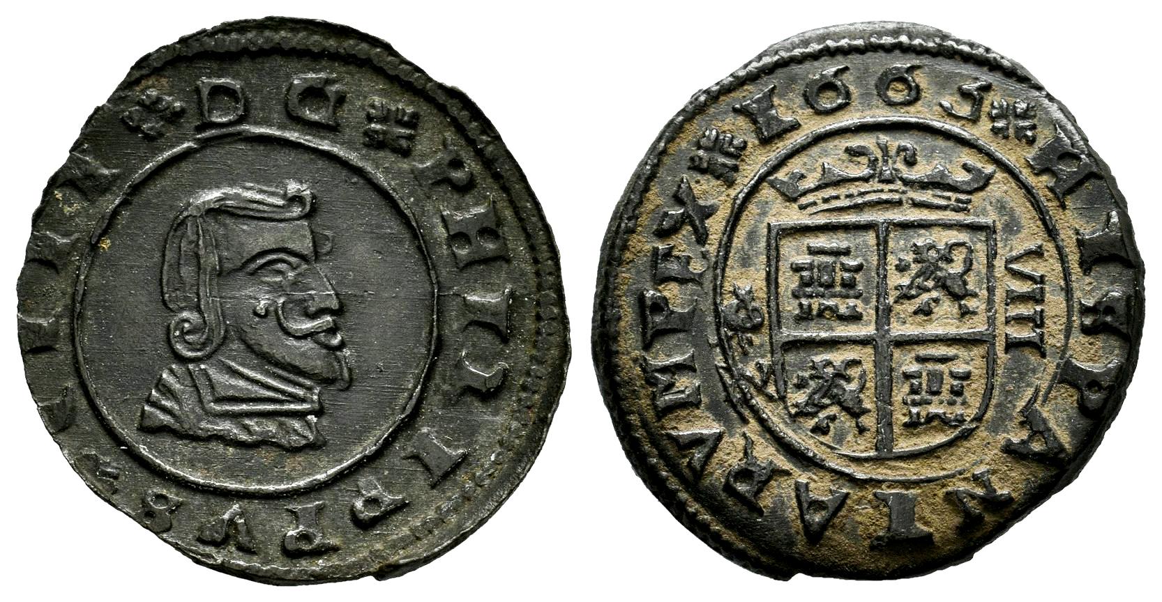 Felipe IV (1621-1665). 8 maravedís. 1663. Granada. N. (Cal-342 var.). (Jarabo-Sanahuja-M248). Ae. 2,24 g. Variante de leyenda: PEX en lugar de REX. Rara. EBC. Est...80,00.