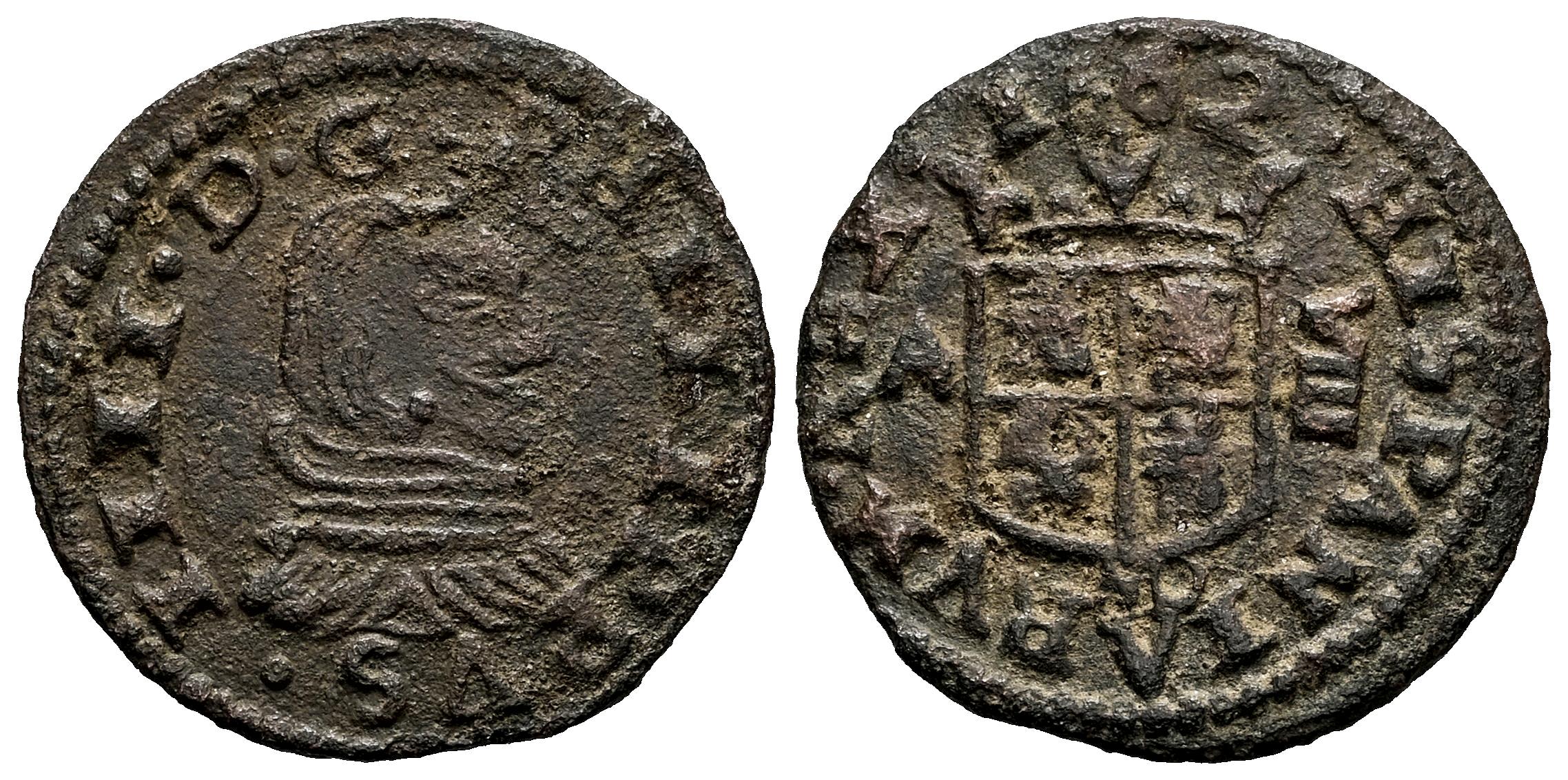 Felipe IV (1621-1665). 8 maravedís. 1662. Madrid. A. (Cal-No cita). (Jarabo-Sanahuja-No cita). (Cy-No cita). Ae. 1,58 g. No aparece en los catálogos especializados. Si aparece este ensayador en los años 1660 y 1661. Muy rara. MBC+/MBC. Est...75,00.
