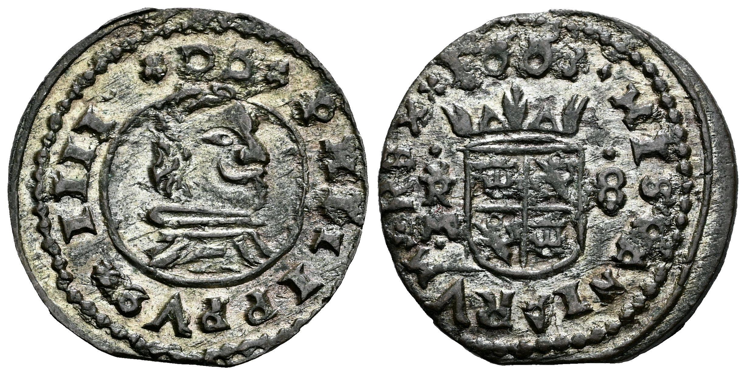 Felipe IV (1621-1665). 8 maravedís. 1663. Trujillo. M. (Cal-424). (Jarabo-Sanahuja-M740). Ve. 2,30 g. Conserva gran parte del plateado original. Escasa así. Ex Tauler&Fau 99 (26/11/2021), lote 4329. EBC-/MBC+. Est...70,00.