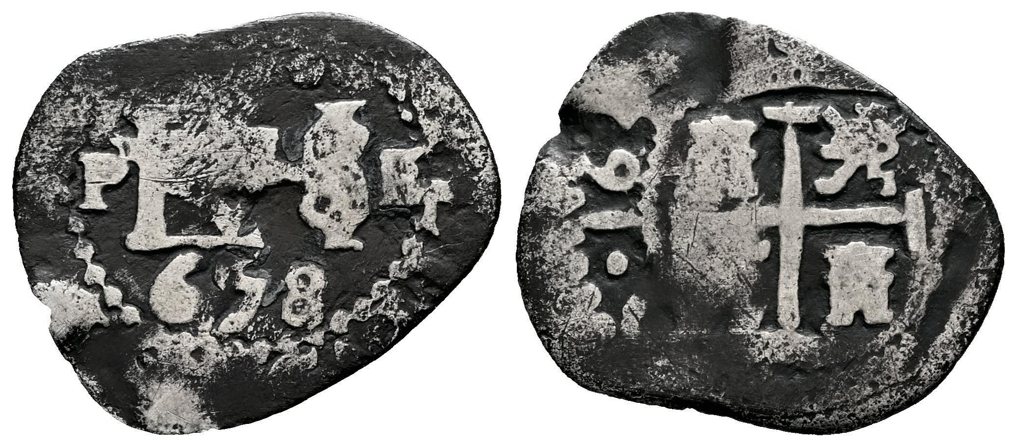 Felipe IV (1621-1665). 1/2 real. 1658. Potosí. E. (Cal-589). Ag. 1,08 g. Doble fecha, la de la leyenda parcial. Escasa. BC+. Est...120,00.