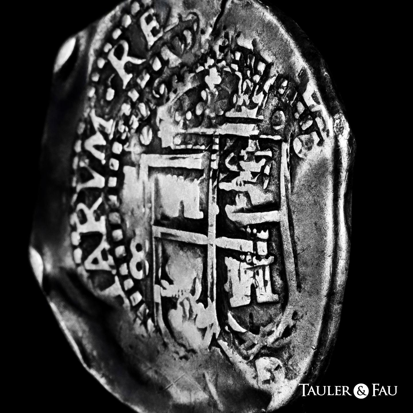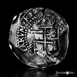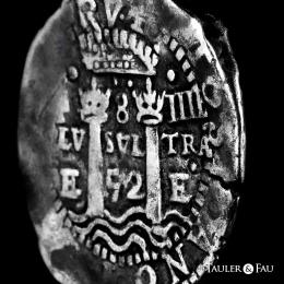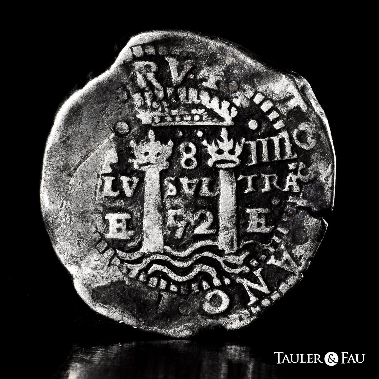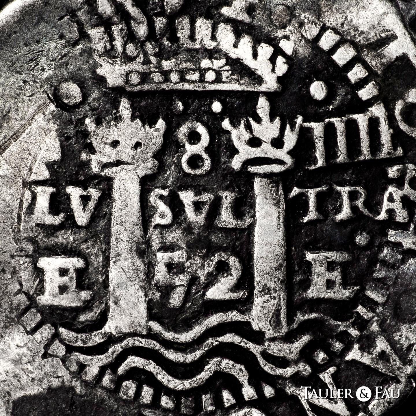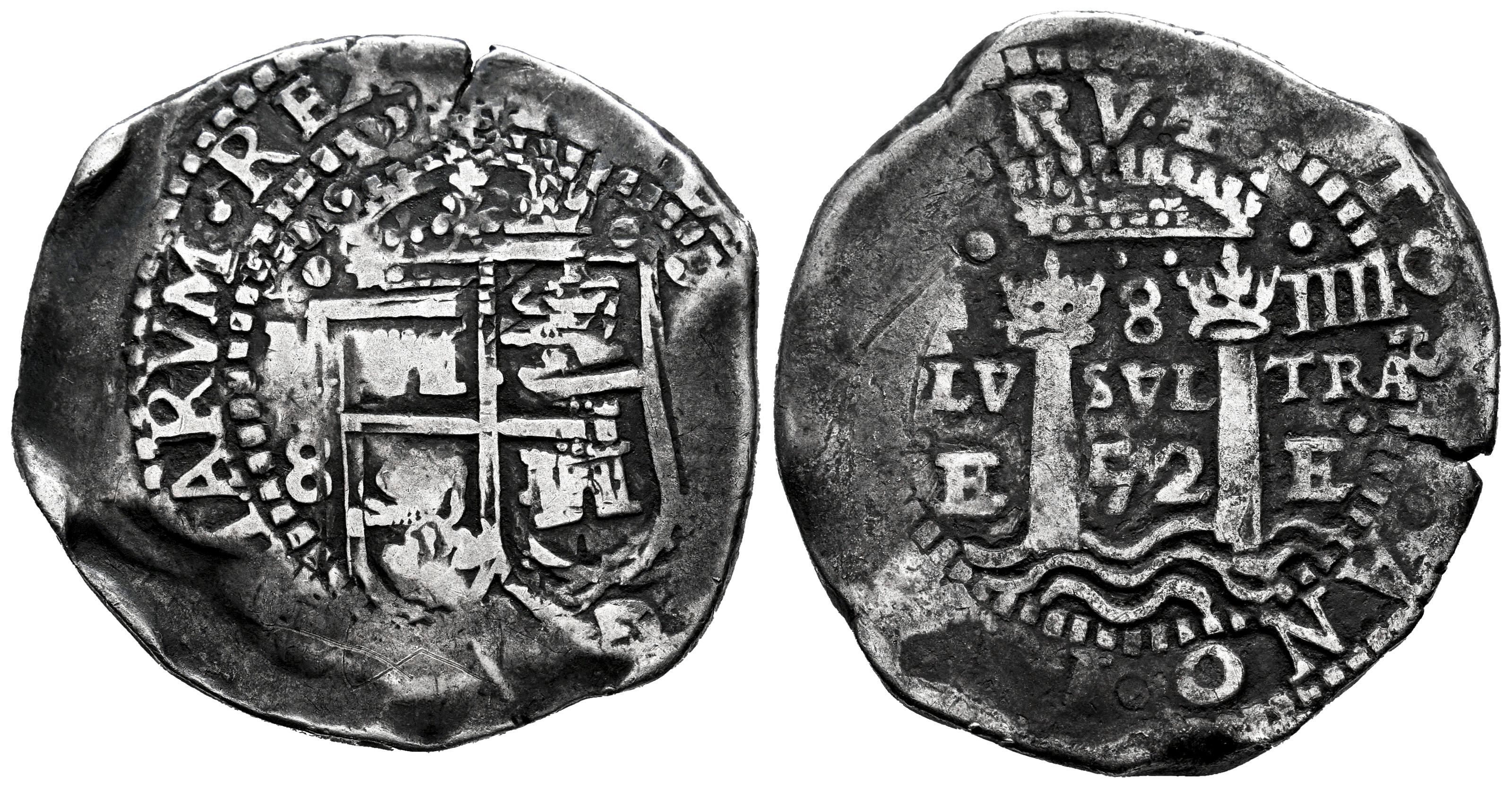 Felipe IV (1621-1665). 8 reales. 1652. Potosí. E. (Cal-1494). Ag. 27,19 g. Tipo transicional. (A/P)/8 a la izquierda, (O/E/52) a la derecha del escudo, F-8-IIII en la parte superior, (P)LV-SVL-TRA y debajo E-52-P. Doble acuñación en el anverso. Pátina. Rara. MBC. Est...1000,00.
