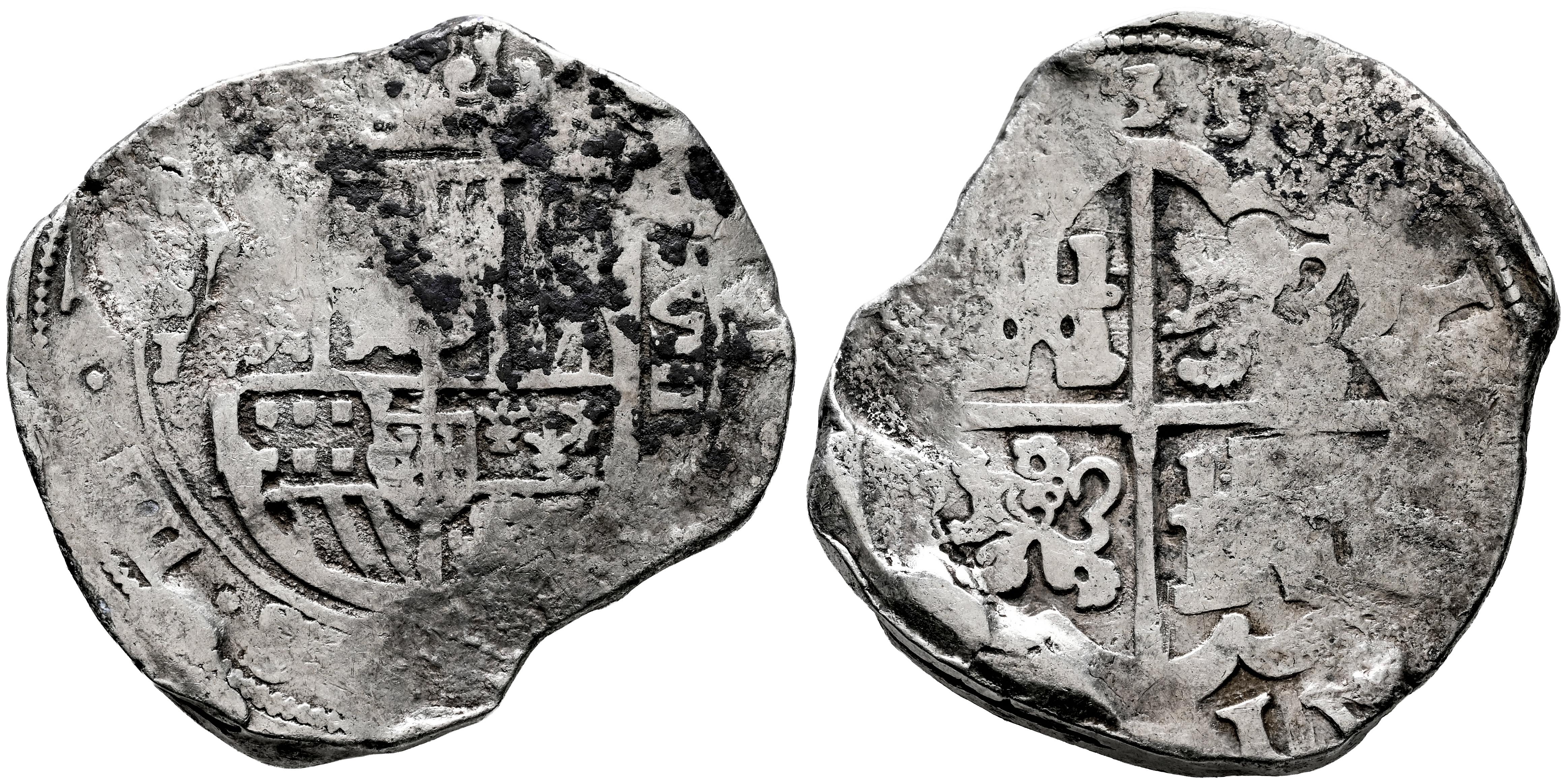 Felipe IV (1621-1665). 8 reales. 1635. Sevilla. R. (Cal-1628). (Jarabo-Sanahuja-C550). Ag. 26,98 g. Visibles los 2 últimos dígitos de la fecha y el ordinal del rey. Orla interior en anverso. Oxidaciones. Rara. Ex Ponteiro, octubre 1995, lote 776. Ex Colección José Octavio Busto. Conserva etiqueta del coleccionista. BC+. Est...450,00.