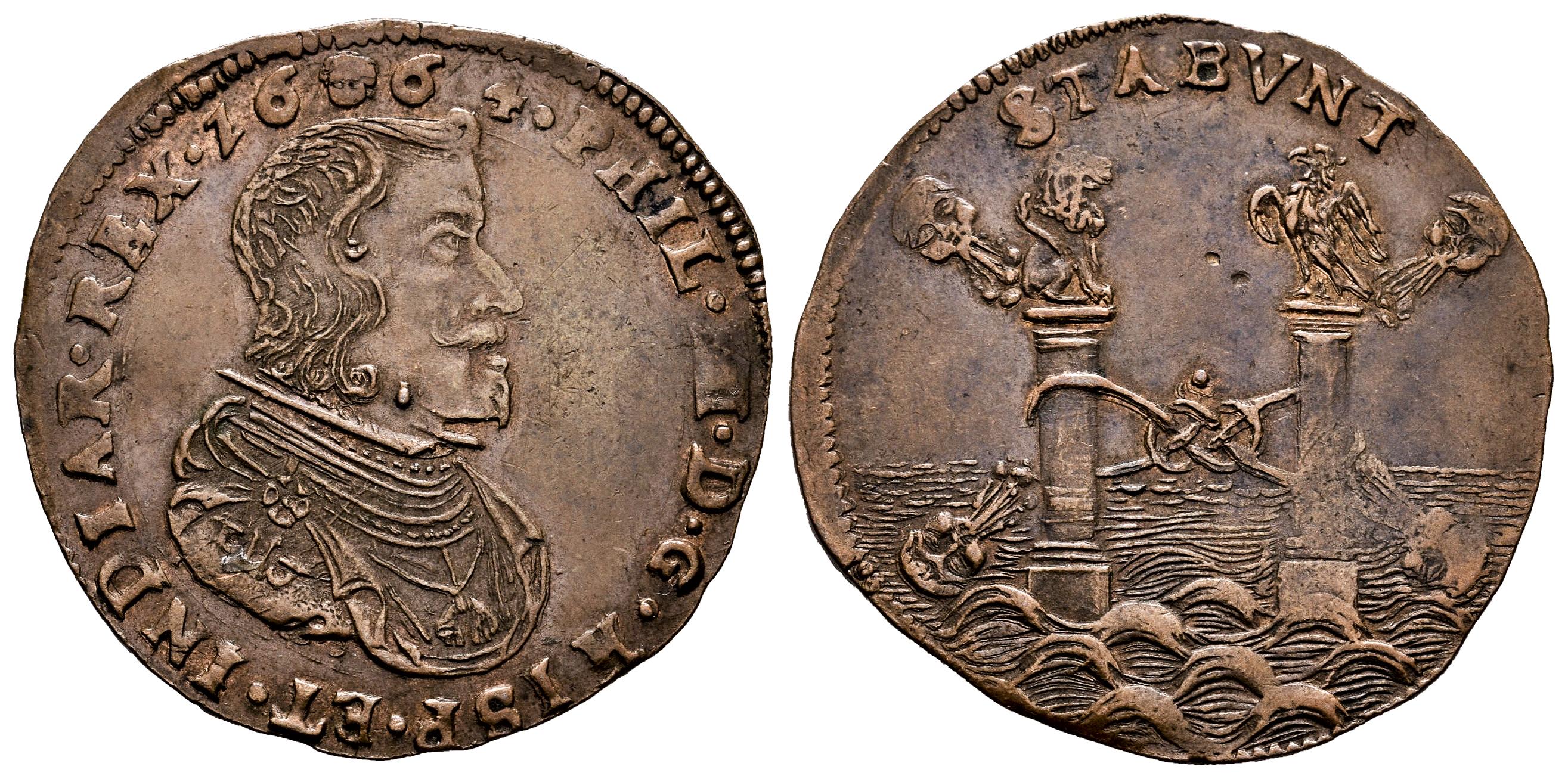 Felipe IV (1621-1665). Jetón. 1664. Bruselas. (Dugn-4204). (Van Loon-II 495). Rev.: STABVNT. Columnas de Hércules batidas por las olas y los vientos, rematadas por un león y un águila. Ae. 6,02 g. Alianza de España y Austria. EBC-. Est...70,00.