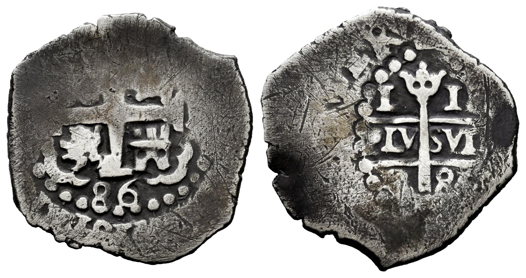 Carlos II (1665-1700). 1 real. 1686. Lima. (R). (Cal-216). Ag. 3,43 g. Doble fecha, una de ellas parcial. Tono. MBC/MBC-. Est...100,00.