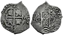 Carlos II (1665-1700). 2 reales. 1689. Potosí. VR. (Cal-422). Ag. 6,02 g. Doble fecha y triple ensayador. Tono. MBC+. Est...220,00.