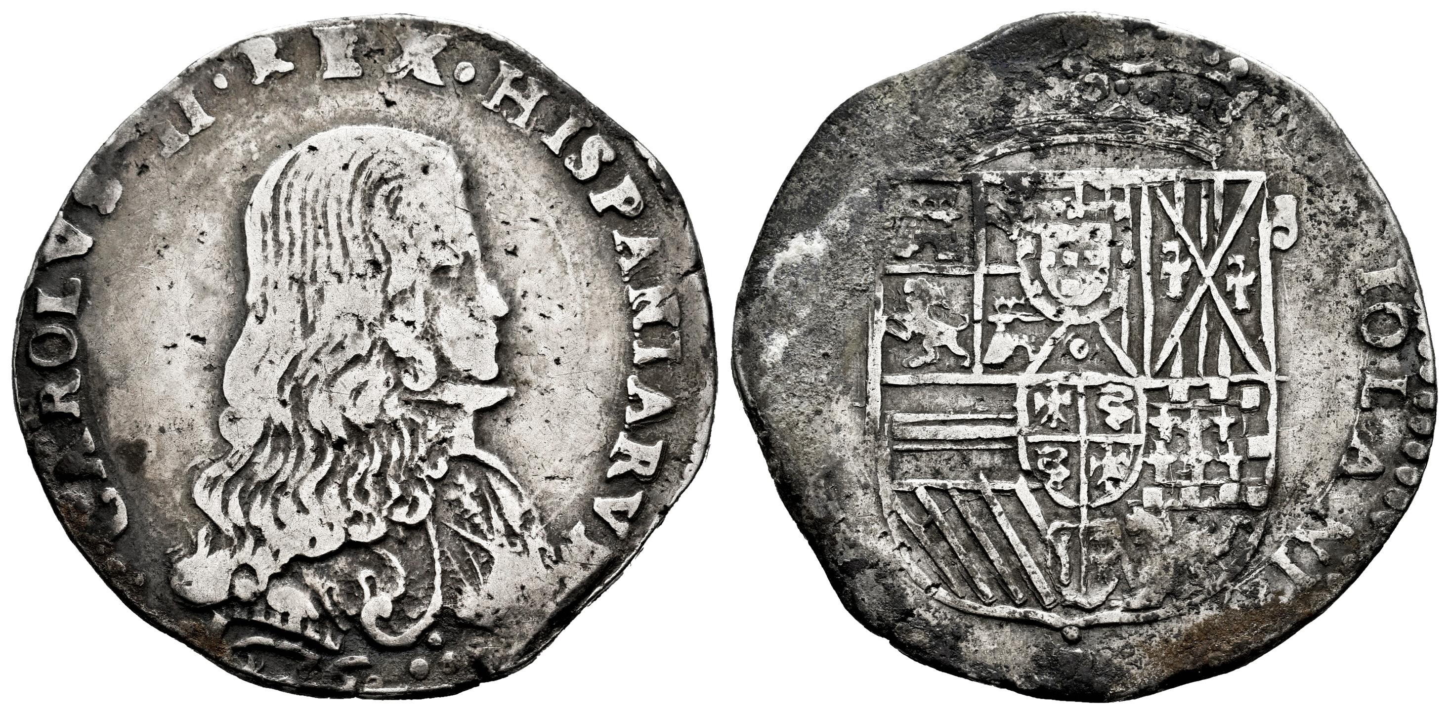 Carlos II (1665-1700). 1/2 felipe. 1676. Milán. (Tauler-3096). (Vti-16). (Mir-388/1). Ag. 13,59 g. Busto juvenil. Oxidaciones. Escasa. BC+. Est...250,00.