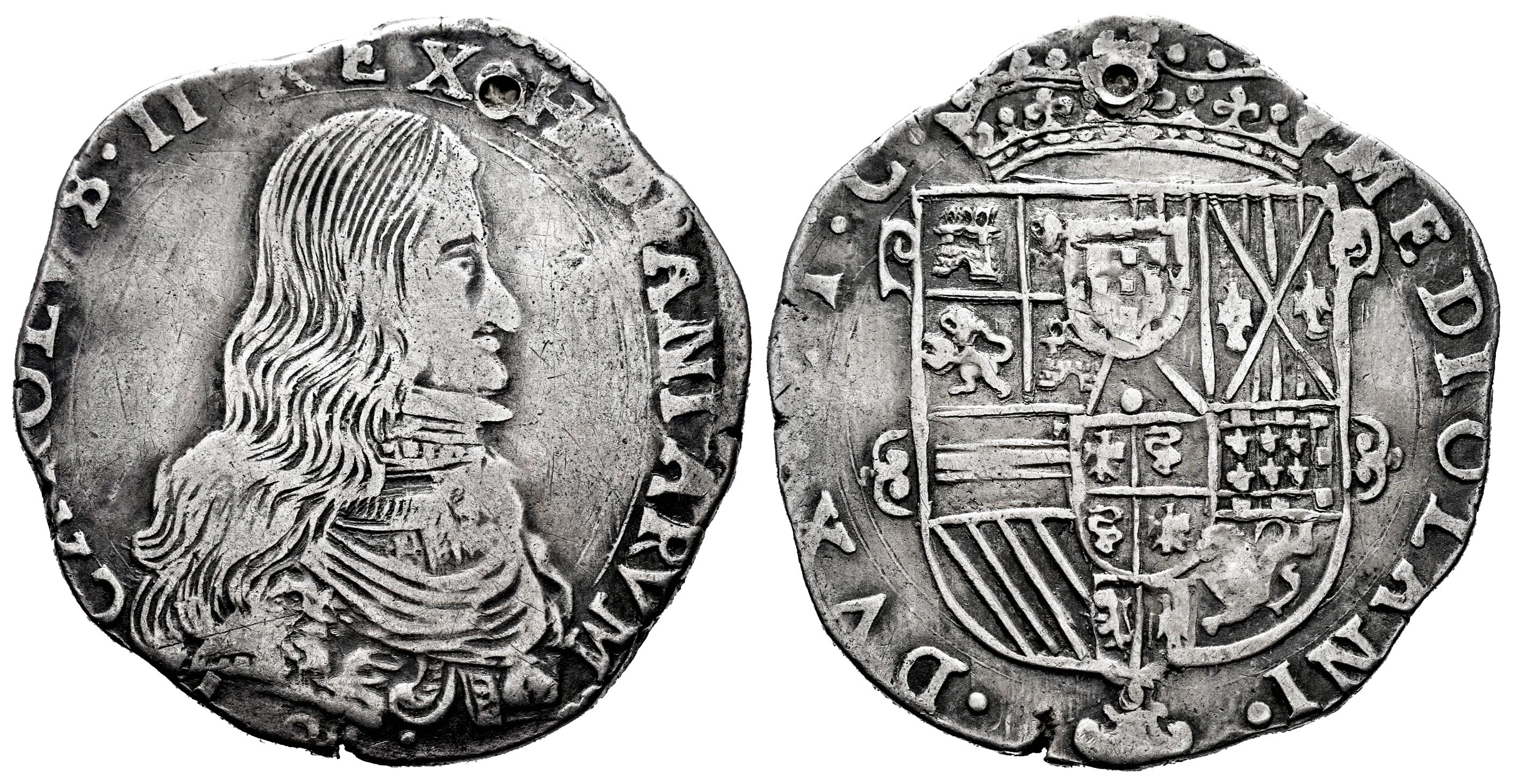 Carlos II (1665-1700). 1/2 felipe. 1694. Milán. (Tauler-3097). (Vti-17). (Mir-388/2). Ag. 13,44 g. Intento de perforación. Cospel irregular. Escasa. MBC-. Est...120,00.