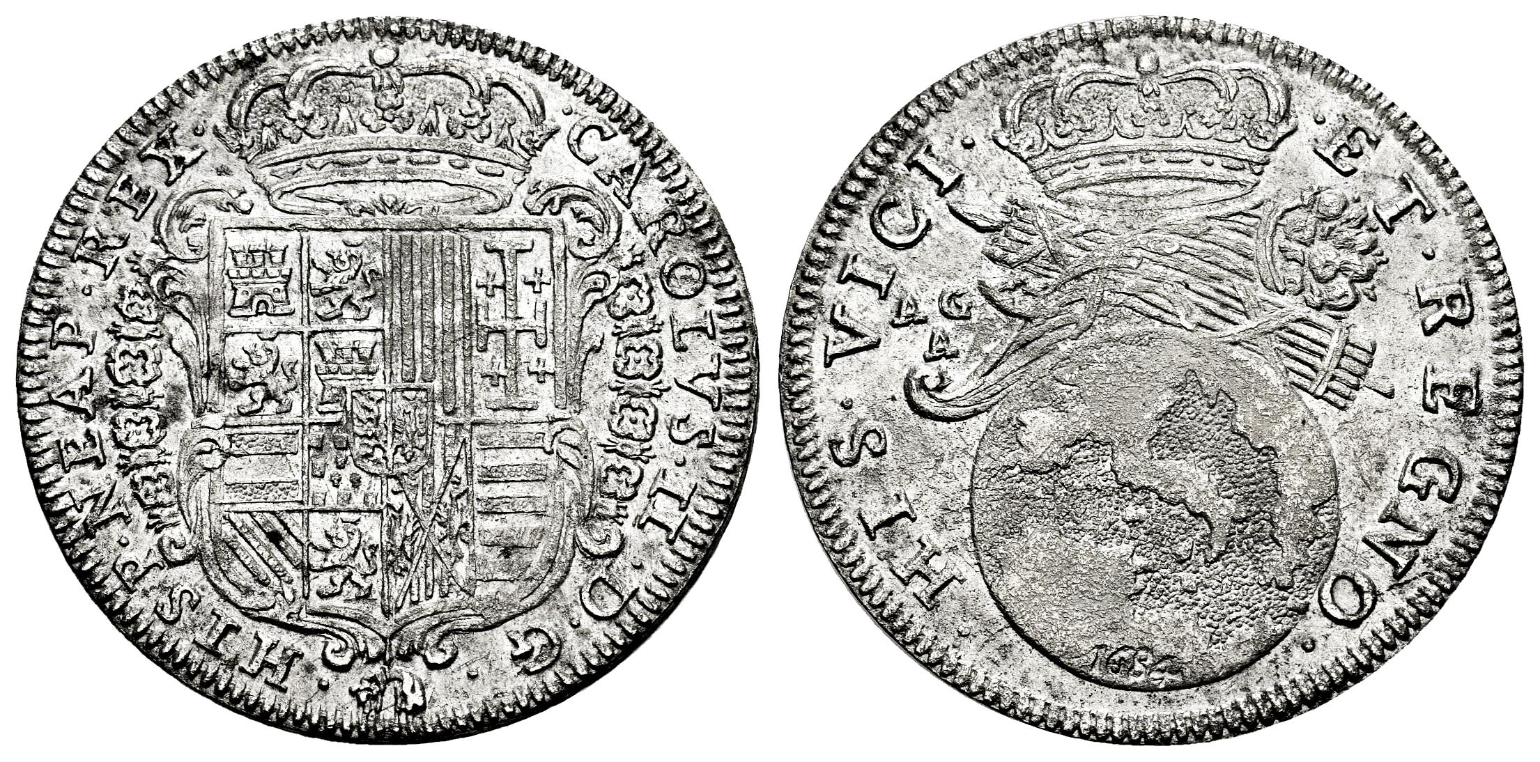 Carlos II (1665-1700). 1 tari. 1684. Nápoles. AG/A. (Tauler-3175). (Vti-No cita). (Mir-298/3). Ag. 5,52 g. Restos de brillo original. EBC. Est...250,00.