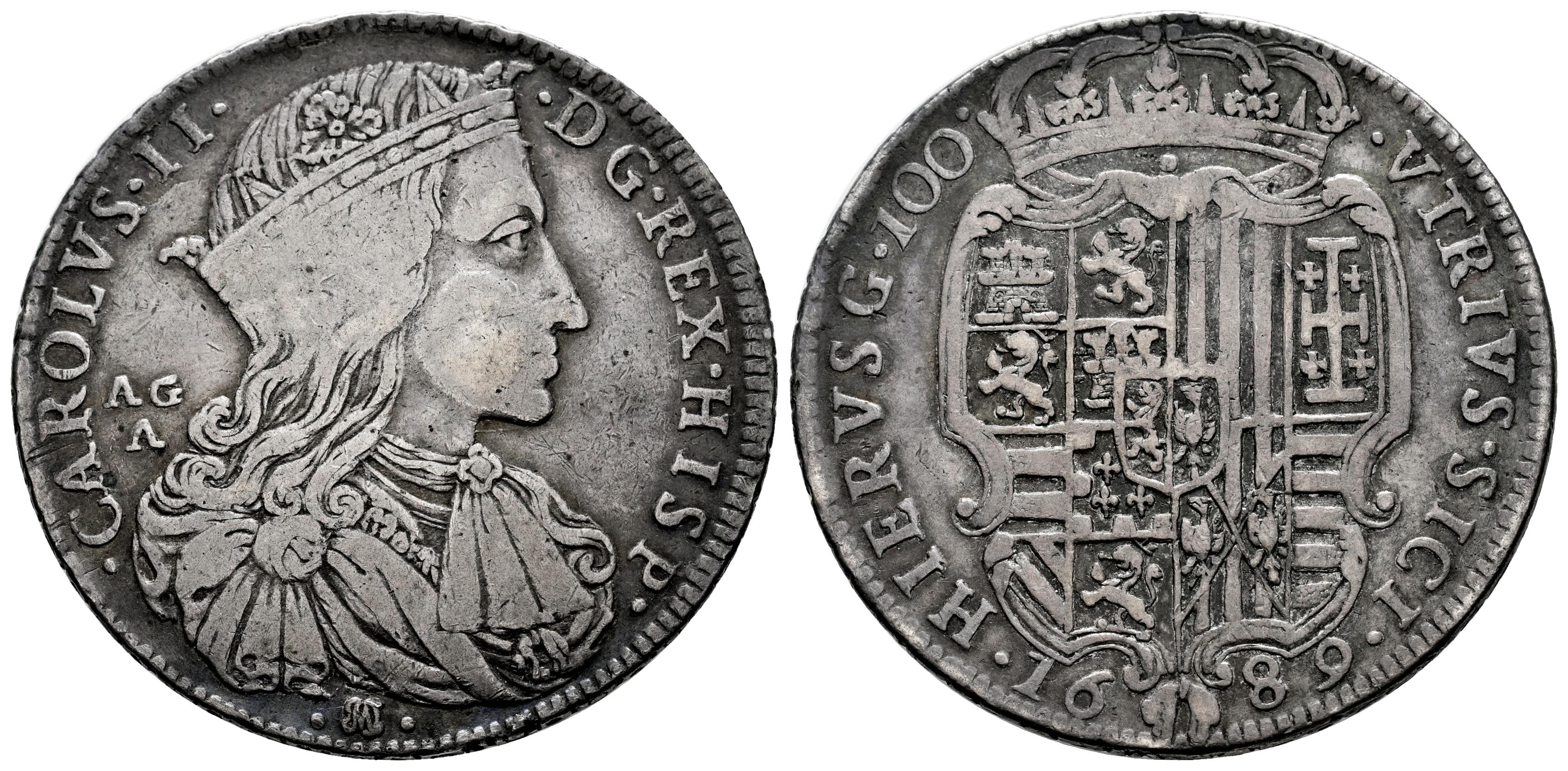 Carlos II (1665-1700). Nápoles y Sicilia. Ducato da 100 Grana. 1689. Nápoles. AG A. (Pannuti-Riccio-2a). (MIR-293/1). Ag. 25,03 g. MBC-. Est...250,00.