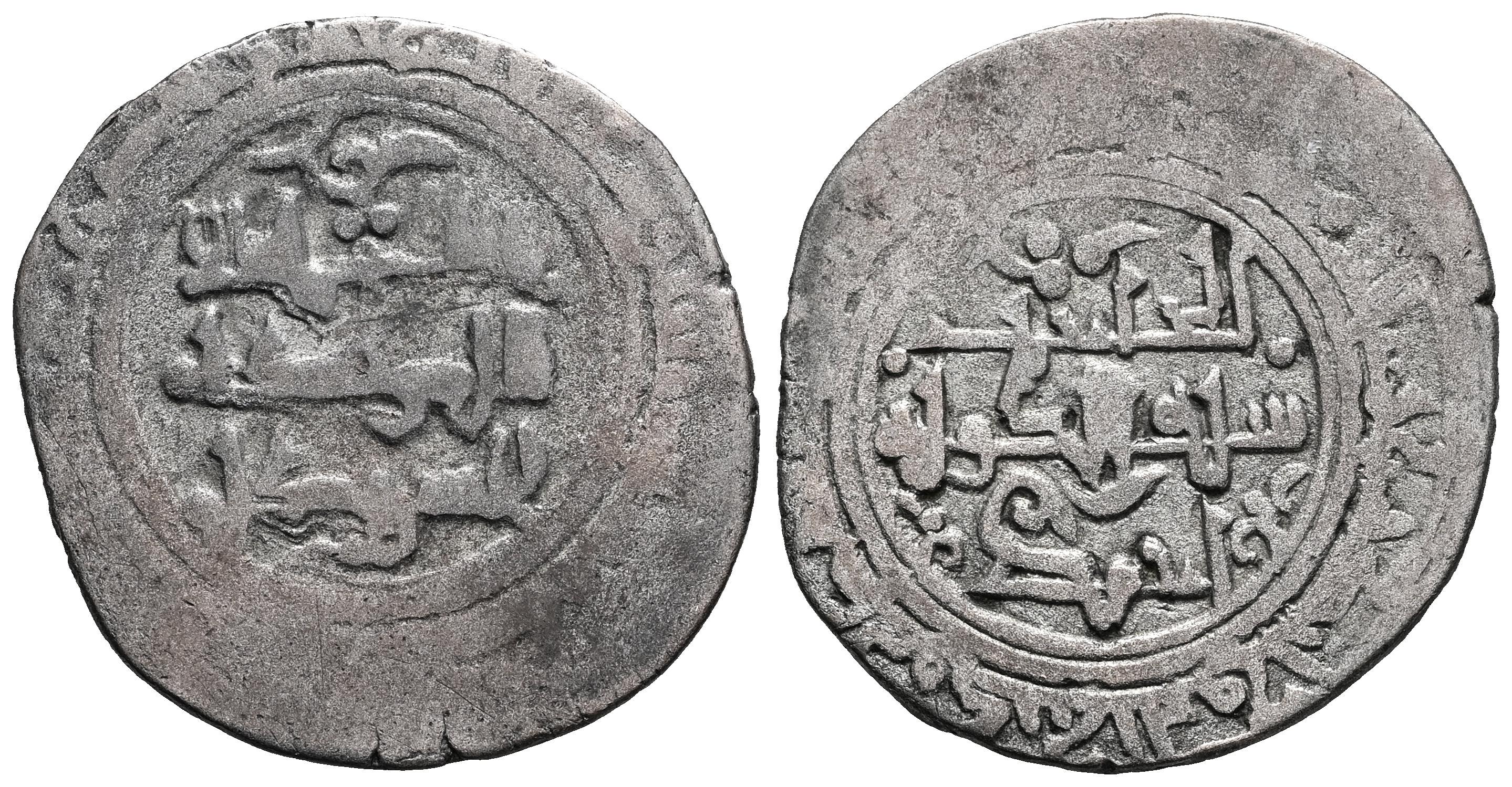 Reinos de Taifas. Ahmad II ibn Yusuf al-Musta'in. Dirham. 48¿2? H. Saraqusta (Zaragoza). Taifa de Zaragoza. (Vives-1224). (Prieto & Vives-271e). Ve. 4,80 g. Rara. MBC-. Est...120,00.