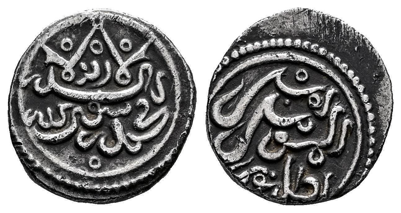 Taifas Almorávides. Muhammad ibn ’Ali ibn al-Hadjam. Quirate. 540-545 H. Batalyus (Badajóz). (Fbm-J1). (Vives-1987). Ag. 0,93 g. Pequeño desplazamiento en reverso. Muy rara. EBC-. Est...400,00.