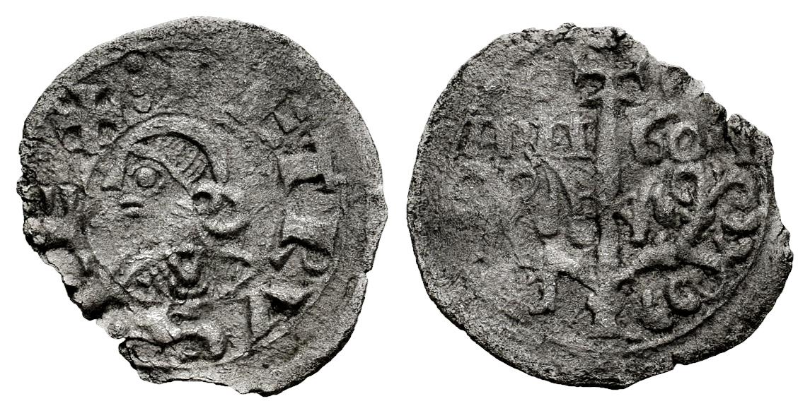 Reino de Navarra. Pedro el de Huesca (1094-1104). Óbolo. Jaca (Huesca). (Ros-3.5.9/1). (Cru V.S-214.1). Anv.: ︙PETRVS · REX. Busto a la izquierda. Rev.: ARA - GON. Árbol superado por cruz, con dos ramas que parten desde la base. Roeles a los lados de la cruz. Ve. 0,36 g. Rara. Ex Colección Príncipe de Viana, Tauler&Fau (24/06/2024), lote 1042. Conserva la etiqueta de la subasta. MBC. Est...90,00.