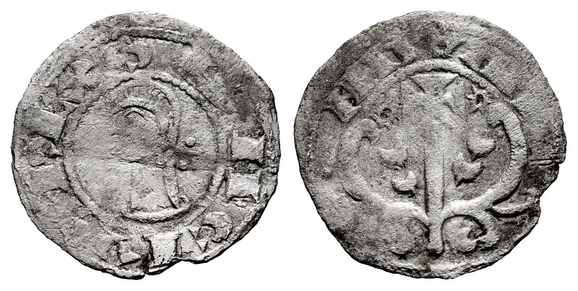 Reino de Navarra. Sancho VI, el Sabio (1150-1194). Óbolo. Navarra. (Ros-3.8.3/2). Anv.: ︙ SANCIVS REX. Busto a la izquierda. Rev.: NAVARA. Árbol coronado por una cruz con roeles estrellados a cada lado. Ve. 0,38 g. Busto pequeño más estilizado. Leve doblez. Muy rara. Ex Colección Príncipe de Viana, Tauler&Fau (24/06/2024), lote 1096. Conserva la etiqueta de la subasta. MBC-. Est...150,00.