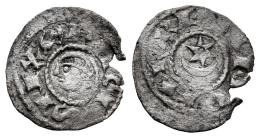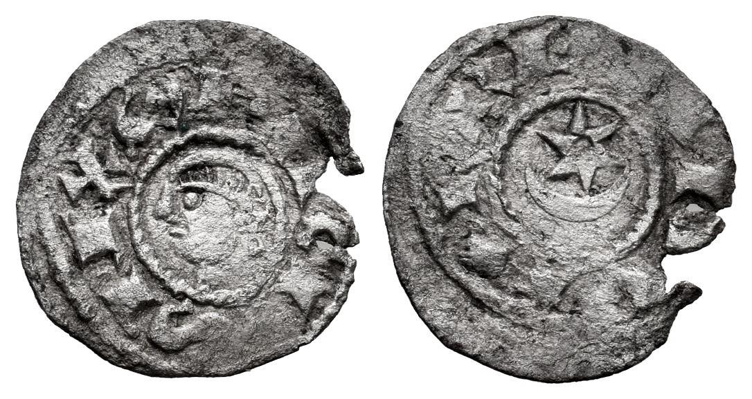 Reino de Navarra. Sancho VII, el Fuerte (1194-1234). Óbolo. Navarra. (Ros-3.9.7/1 var). Anv.: : SAИCIVS · REX. Busto a la izquierda . Rev.: · NAVARRE. Creciente y roel estrellado. Ve. 0,34 g. Cospel ligeramente faltado. Rara. Ex Colección Príncipe de Viana, Tauler&Fau (24/06/2024), lote 1137. Conserva la etiqueta de la subasta. MBC-. Est...100,00.