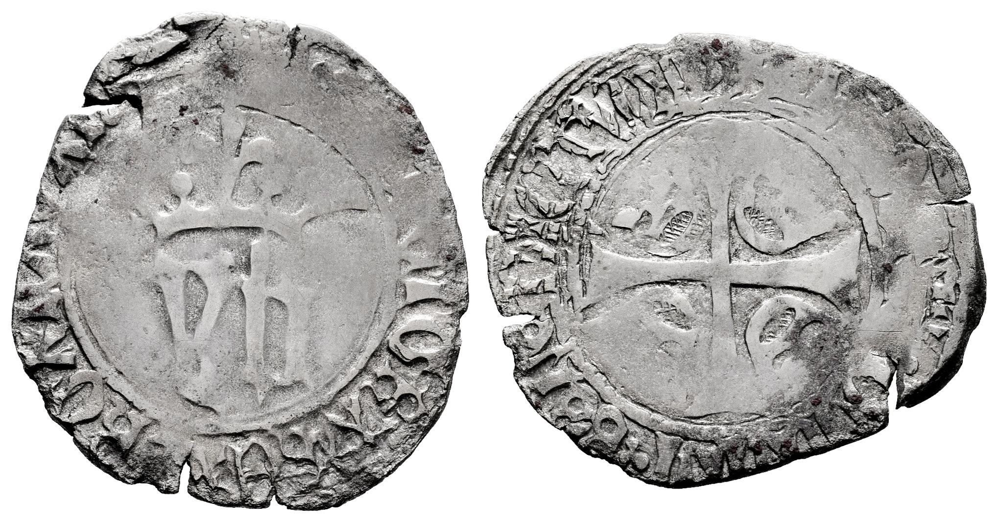 Reino de Navarra. Juan y Blanca (1425-1441). Blanca. Navarra. (Ros-3.16.3 var). (Cru V.S-254.1). Anv.: ... EI GRA * REX Z RGA NAVA ... . YB coronadas. Rev.: ... DOMINI ∗ BENEDICTVM. Cruz, con coronas reales en los cuartos interiores. Ag. 2,79 g. Escasa. Ex Colección Príncipe de Viana, Tauler&Fau (24/06/2024), lote 1253. Conserva la etiqueta de la subasta. MBC-/BC+. Est...150,00.