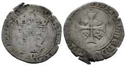 Reino de Navarra. Juan y Catalina (1483-1512). Tarja. Navarra. (Ros-3.20.16/1?). (Cru V.S-292 var). Anv.: (+) : IOHANES : ET : K( · ATH)ERINA : R... . IK góticas coronadas, ¿acotadas por puntos?, debajo P. Rev.: + : SIT : NOMEN DOMINI : B(ENEDICT). Cruz con I en el 1º cuartel, K en el 4º cuartel y coronas en el 2º y 3º cuartel. Ve. 1,46 g. Rara. Ex Colección Príncipe de Viana, Tauler&Fau (24/06/2024), lote 1329. Conserva la etiqueta de la subasta. BC+. Est...75,00.