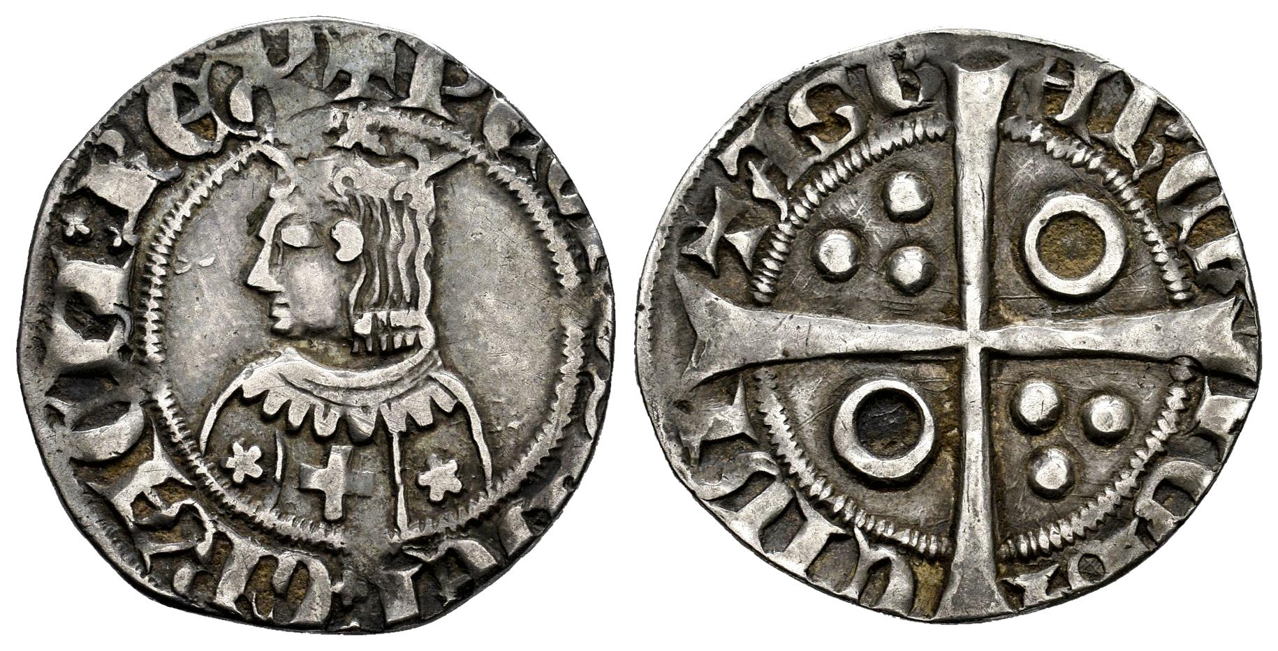 Corona de Aragón. Pedro IV (1336-1387). Croat. Barcelona. (Cru-408.3). (Cru-2220b). Anv.: + PETRUS : DEI : GRACIA : REX. Rev.: CIVI TASB ARCh NONA. Ag. 2,67 g. Flores de cinco pétalos en el vestido. Con anillos en 2º y 3º cuadrante. Pátina. EBC. Est...200,00.