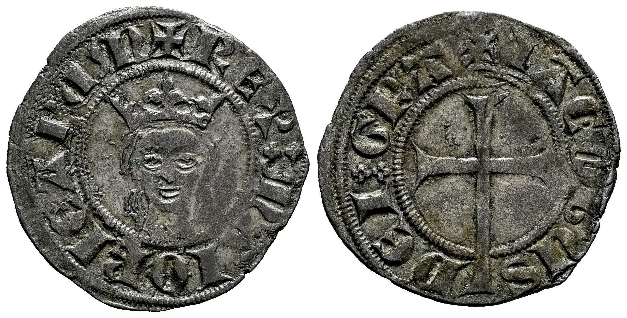 Corona de Aragón. Jaime II de Mallorca (1276-1285 y 1298-1311). Dobler. Mallorca. (Cru V.S-538). (Cru C.G-2505). Ve. 1,48 g. La C de IACOBUS abierta y con un puntito en el centro. Atractiva. Ex Colección Isabel de Trastámara, Áureo&Calicó (17/02/2022), lote 285. MBC+. Est...150,00.
