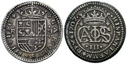 Carlos III, Pretendiente (1701-1714). 2 reales. 1707. Barcelona. (Cal-27). Ag. 5,39 g. Bonita pátina. Escasa. MBC+. Est...150,00.