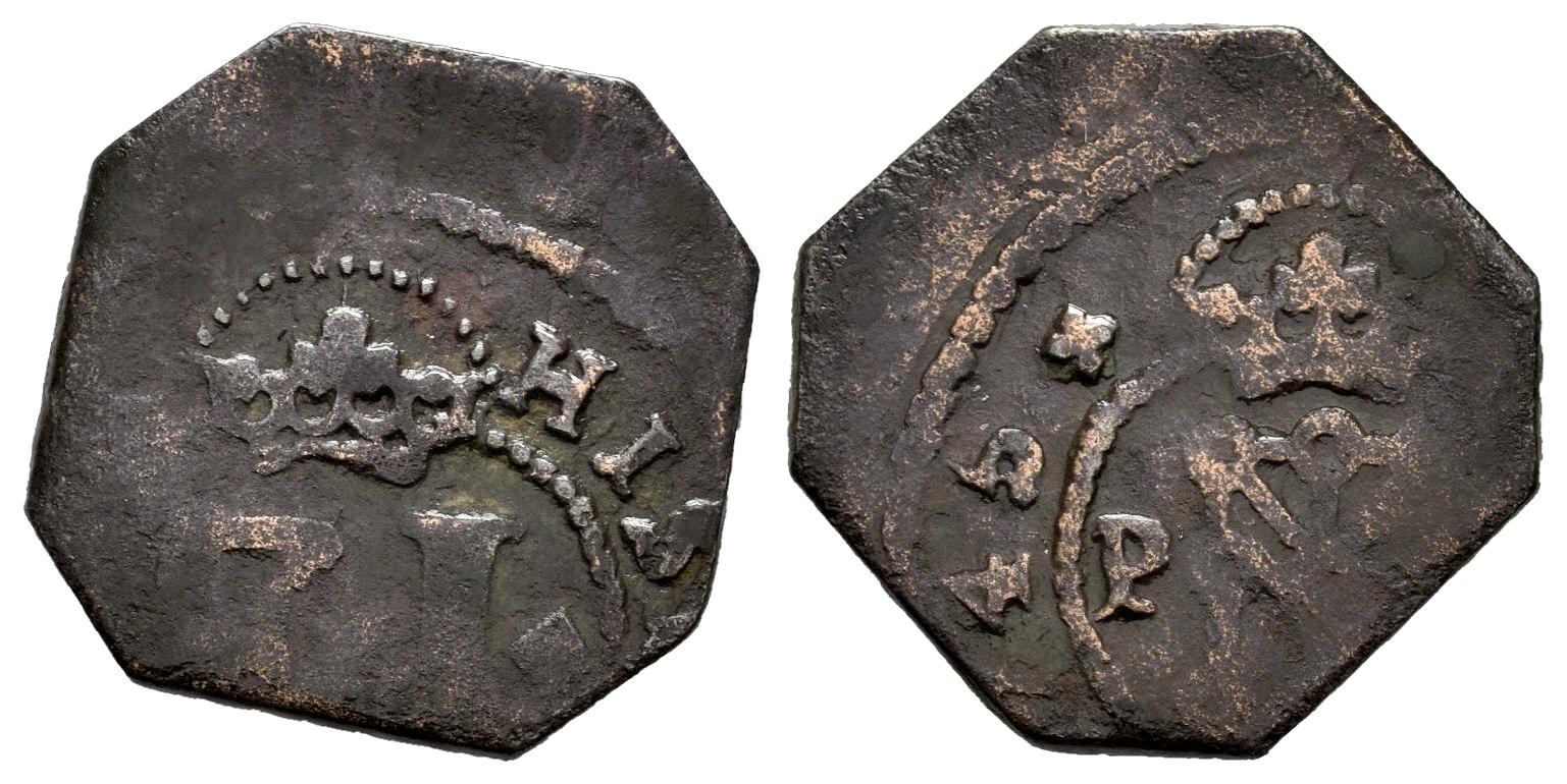 Felipe V (1700-1746). 1 maravedí. 1745. Pamplona. (Cal-35). (Ros-4.7.12). Ae. 2,40 g. Acuñación desplazada habitual en esta emisión. Barnizada. MBC-. Est...50,00.