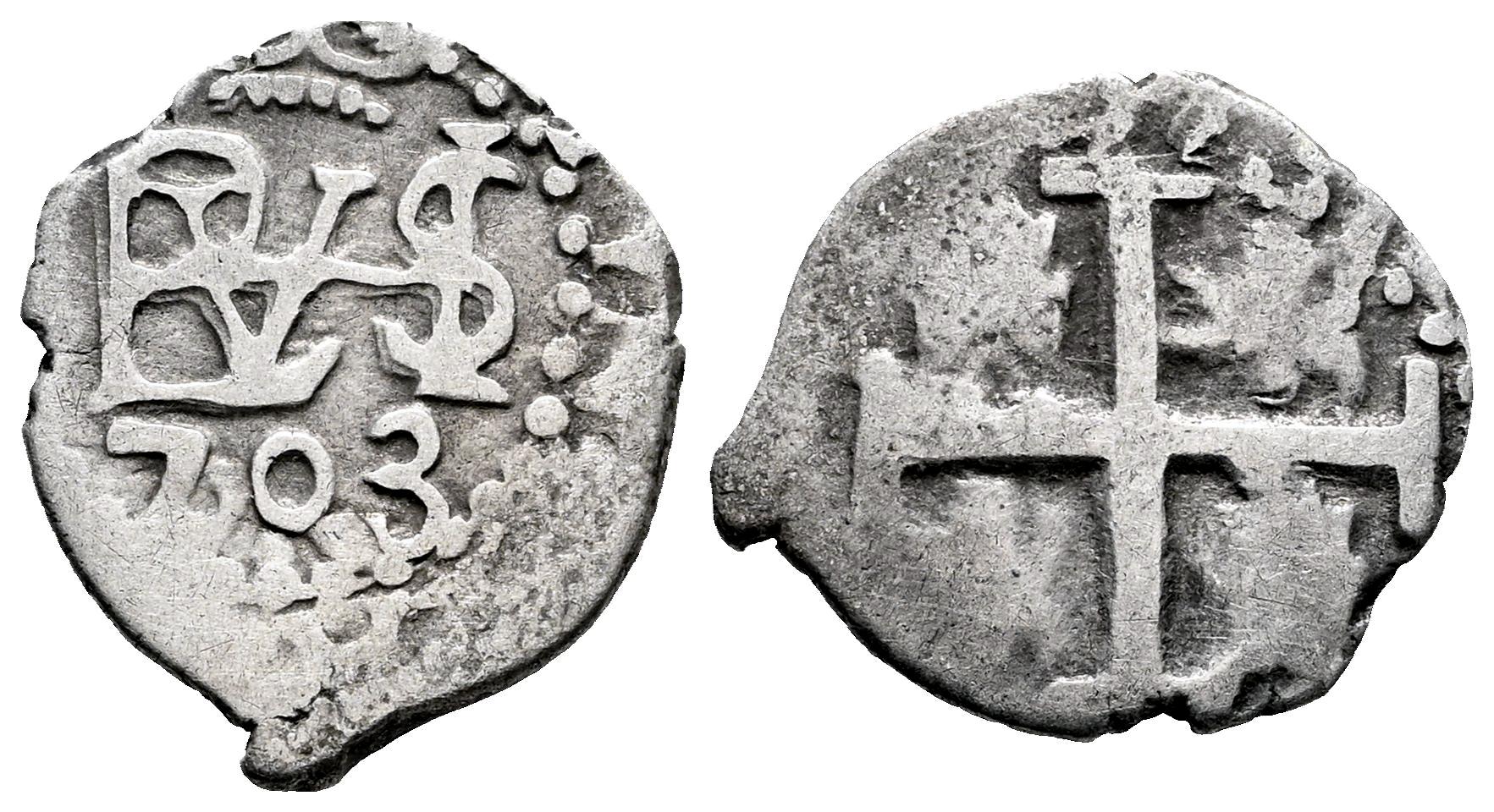 Felipe V (1700-1746). 1/2 real. 1703. Lima. (Cal-132). Ag. 1,26 g. MBC-/BC+. Est...65,00.