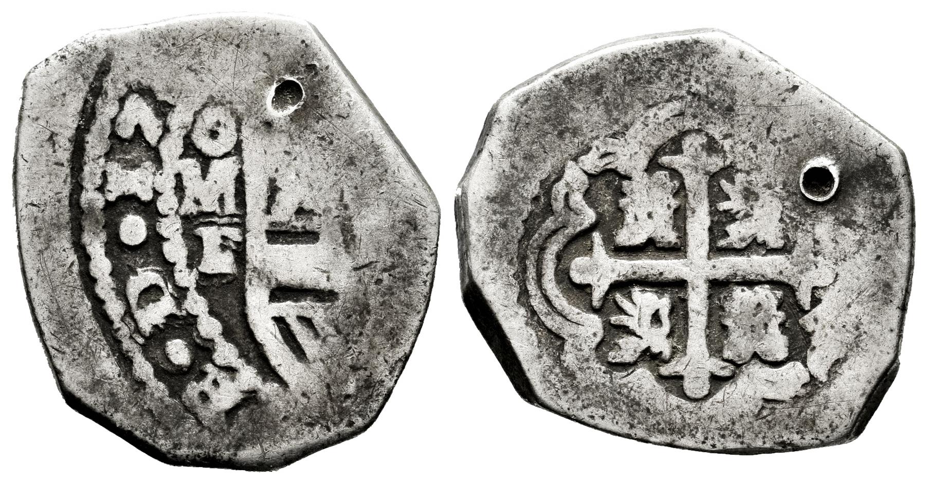 Felipe V (1700-1746). 2 reales. 17.... México. F?. (Cal-798/801). Ag. 5,16 g. Visibles los 2 primeros dígitos de la fecha. Intento de perforación. Escasa. MBC-. Est...220,00.