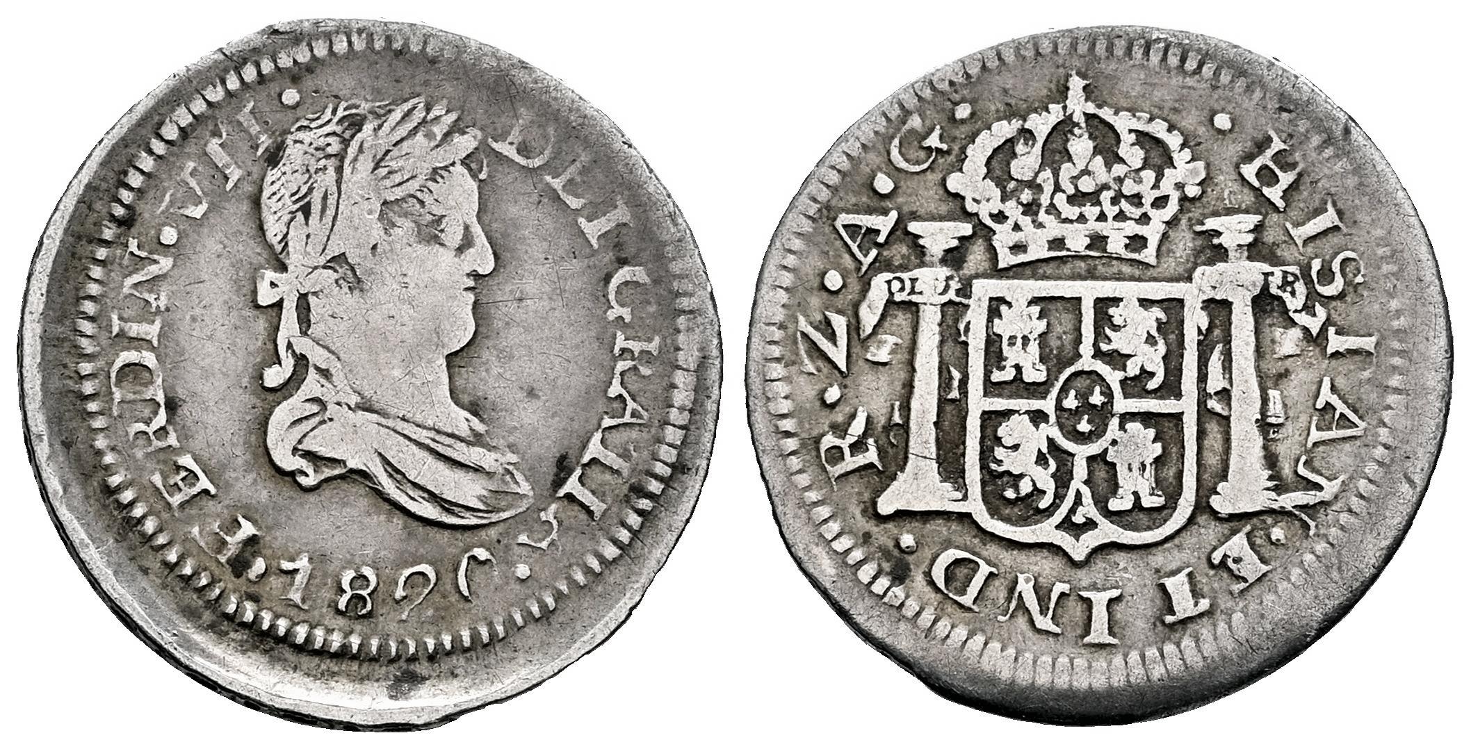Fernando VII (1808-1833). 1/2 real. 1820. Zacatecas. AG. (Cal-494). (Ramírez-ZM.10.1). Ag. 1,63 g. Suave pátina. Flan grande. Escasa . BC+/MBC-. Est...100,00.