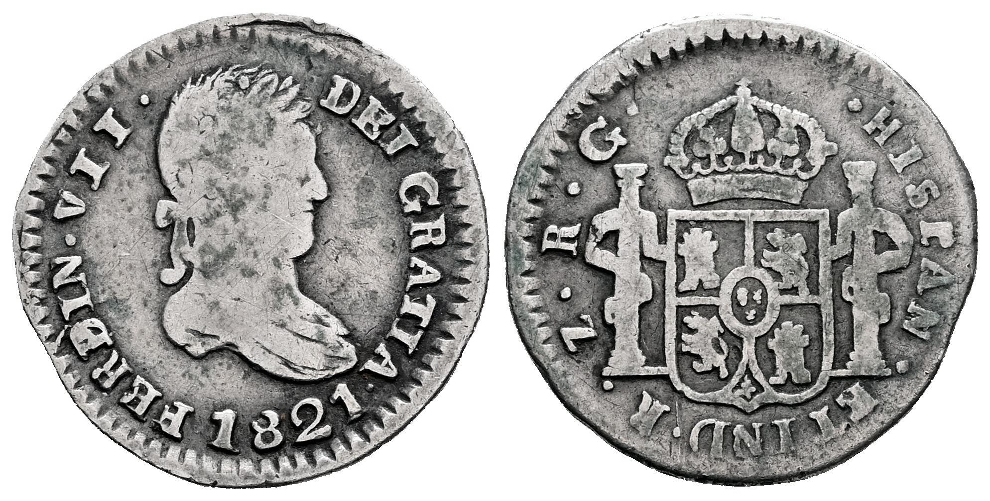 Fernando VII (1808-1833). 1/2 real. 1821. Zacatecas. RG. (Cal-497 var.). (Ramírez-ZM.11.3c). Ag. 1,41 g. Sin punto después de DEI. Escasa. MBC-. Est...150,00.