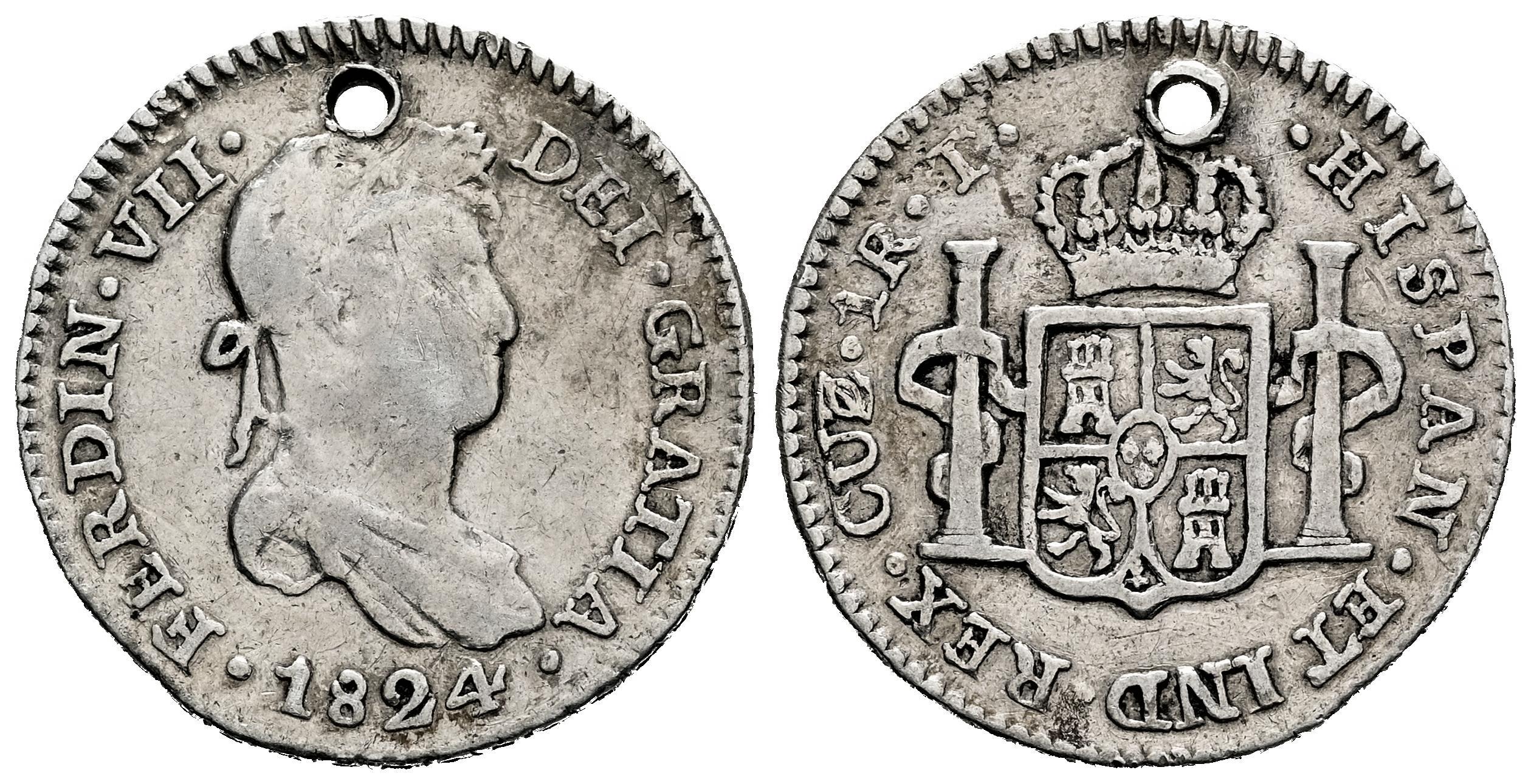 Fernando VII (1808-1833). 1 real. 1824. Cuzco. T. (Cal-537). Ag. 329,00 g. Perforación a las 12 h. Escasa. MBC-. Est...90,00.
