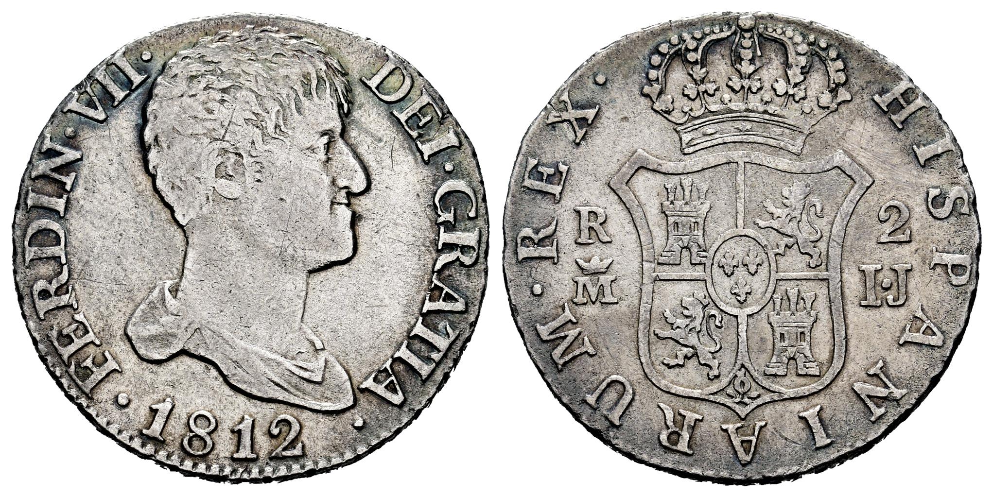 Fernando VII (1808-1833). 2 reales. 1812. Madrid. IJ. (Cal-823). Ag. 5,35 g. Busto desnudo. Leves rayas. Tono. MBC. Est...90,00.