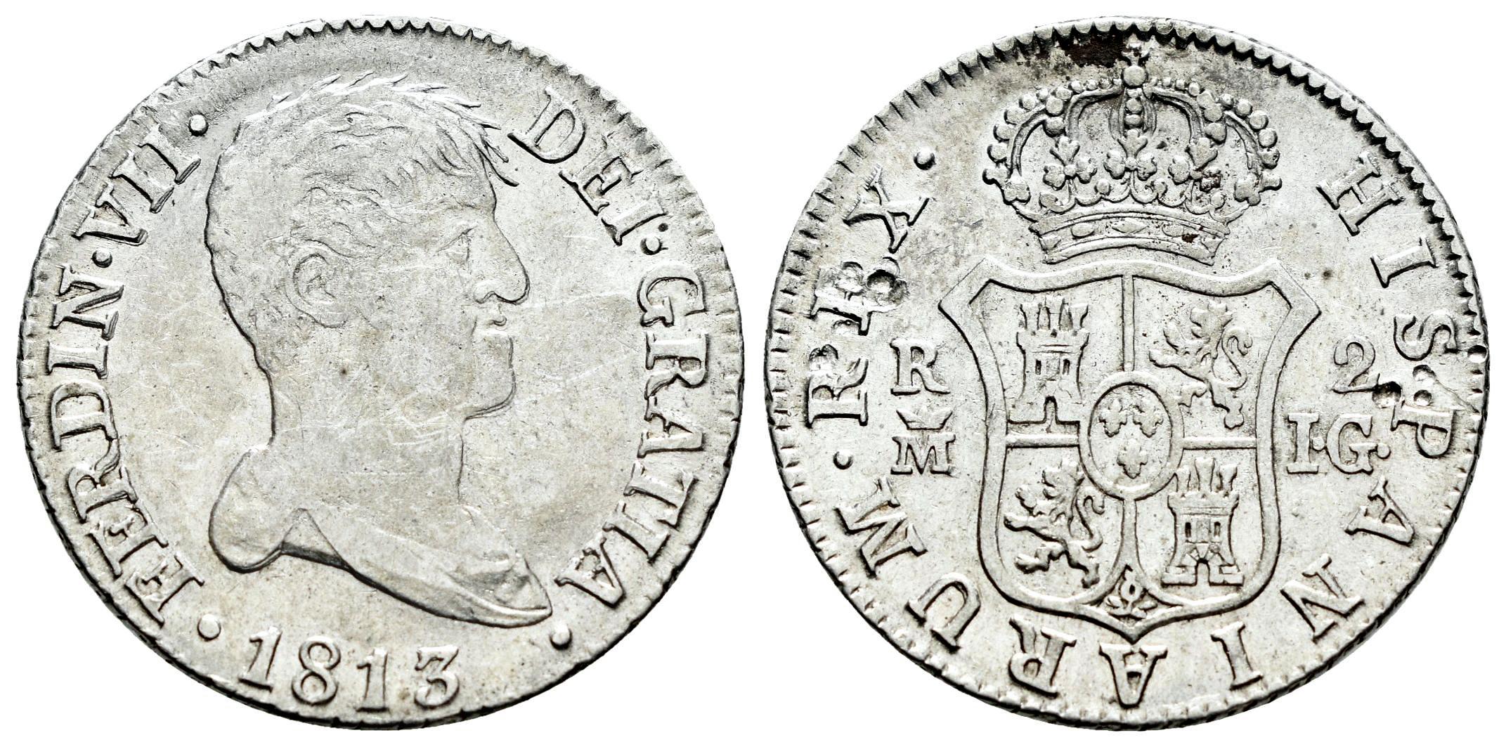 Fernando VII (1808-1833). 2 reales. 1813. Madrid. IJ. (Cal-825). Ag. 5,87 g. Busto desnudo. Leves restos de brillo original. Golpes en reverso. MBC. Est...70,00.