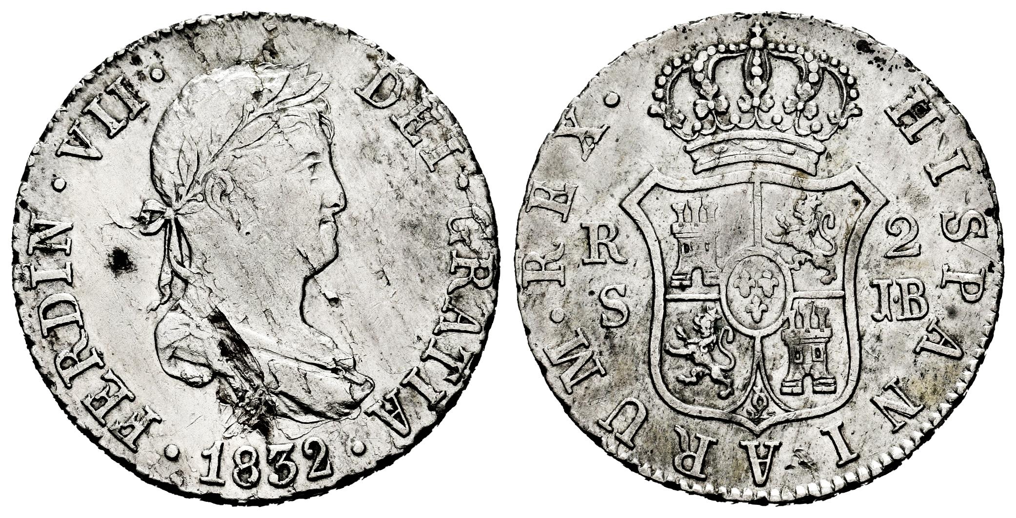 Fernando VII (1808-1833). 2 reales. 1832. Sevilla. JB. (Cal-966). Ag. 5,87 g. Hojas y rayitas en anverso. MBC+. Est...80,00.