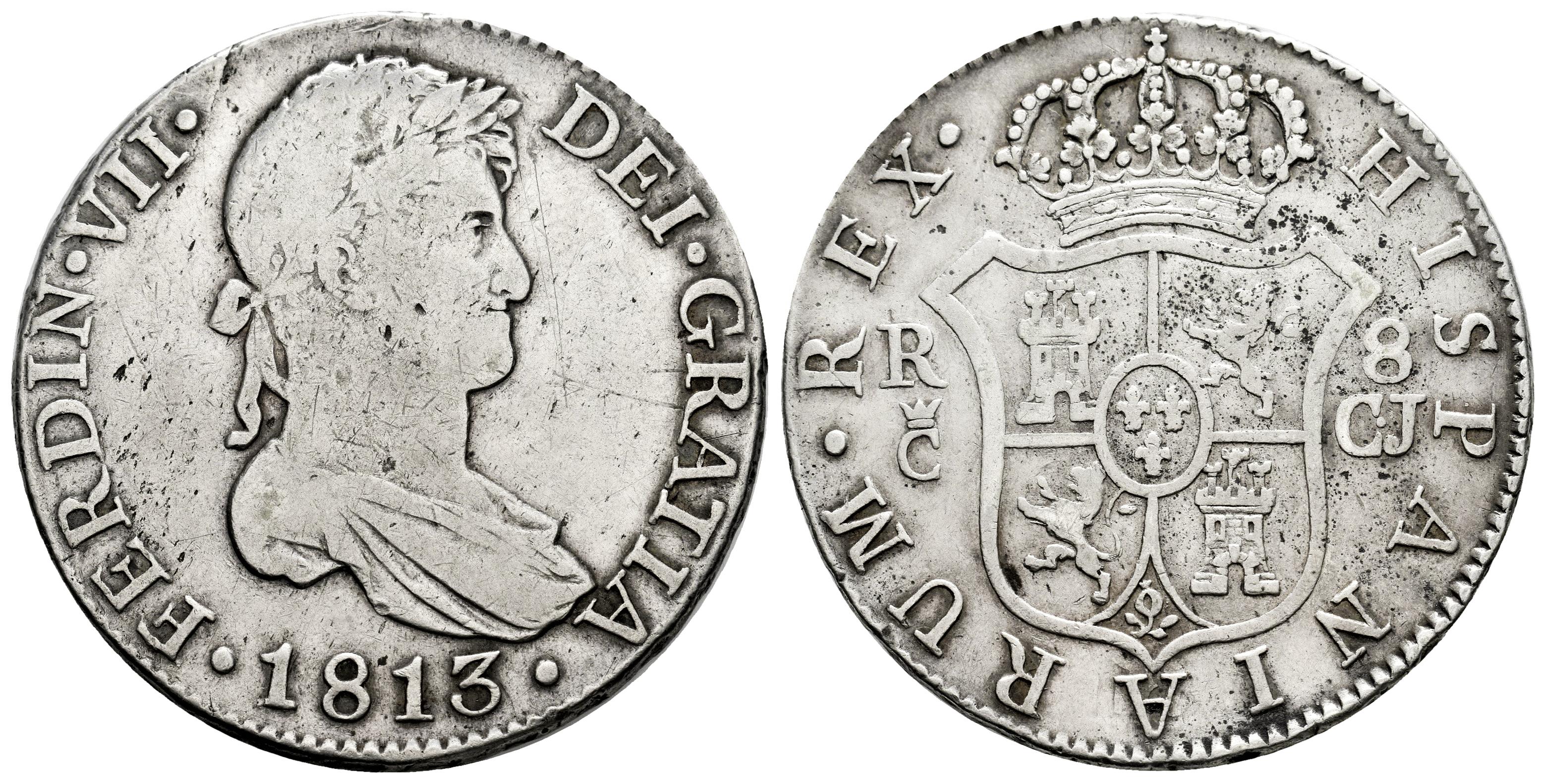 Fernando VII (1808-1833). 8 reales. 1813. Cádiz. CJ. (Cal-1153). Ag. 27,00 g. Finas rayitas en anverso. MBC-. Est...200,00.