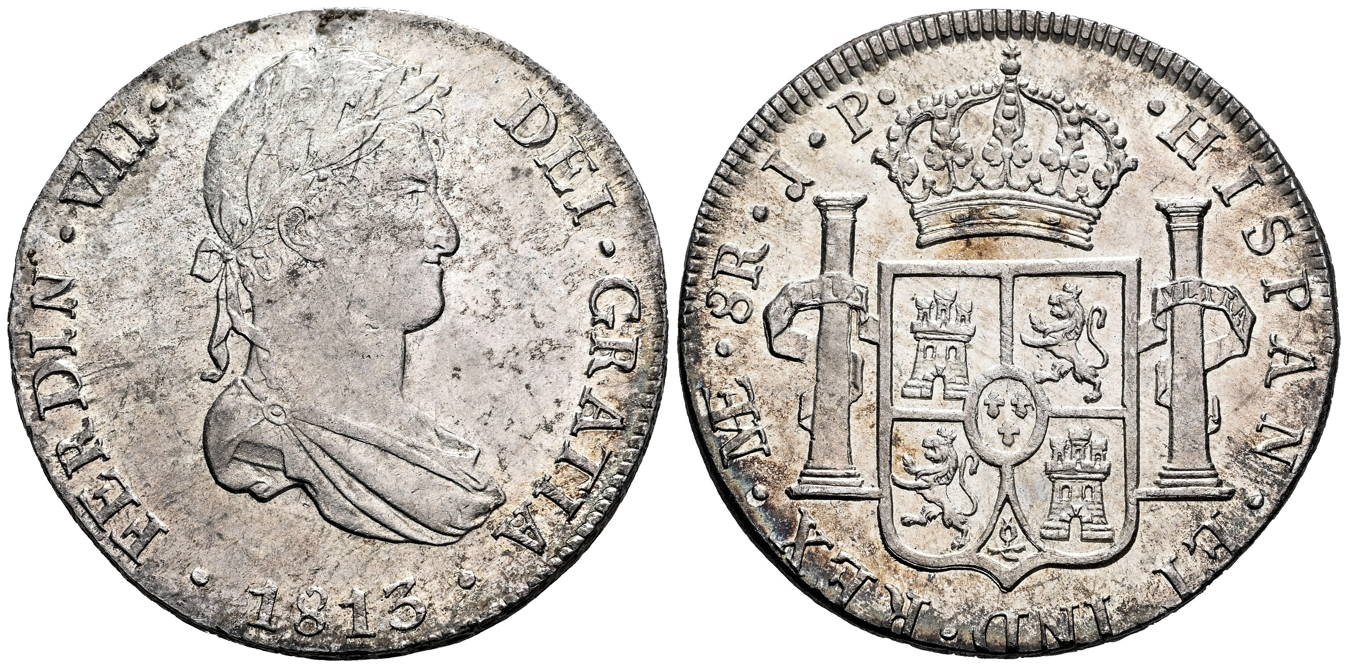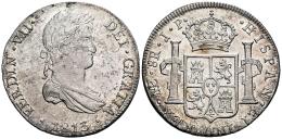Fernando VII (1808-1833). 8 reales. 1813. Lima. JP. (Cal-1246). Ag. 27,30 g. Magnífico ejemplar con pleno brillo original. Muy rara en esta conservación. Estuvo encapsulada por NGC como MS 63. SC. Est...900,00.