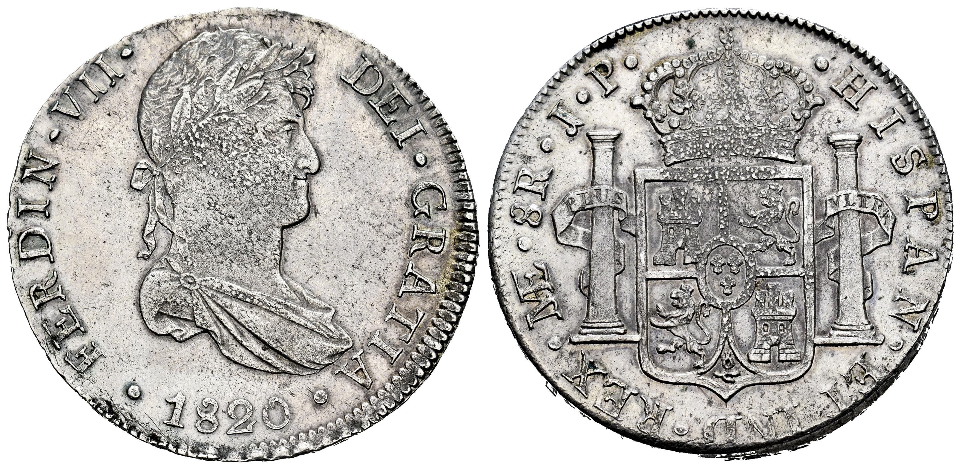 Fernando VII (1808-1833). 8 reales. 1820. Lima. JP. (Cal-1253). Ag. 26,89 g. Cuño sucio. Suave pátina y restos de brillo original. EBC-. Est...220,00.
